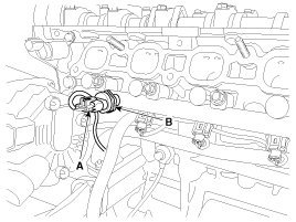 4. Disconnect the rail pressure sensor connector (A), and then remove the sensor (B) from the delivery pipe.