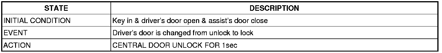 * At DR LOCK in POWER WINDOW SWITCH or CAN LOCK signal reception,With UNLOCK KNOB state independently Lock output Display during 0.5S ± 0.1 secs. At DR UNLOCK in POWER WINDOW SWITCH or CAN UNLOCK signal reception Offer an Unlock output during 0.5 ± 0.1 secs independently with UNLOCK KNOB state. (IGN 1/2 input disregard)