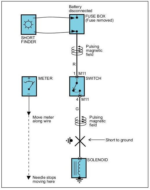 A short finder is available to locate a short to ground. The short finder creates a pulsing magnetic field in the shorted circuit and shows you the location of the short trough body trim or sheet metal.