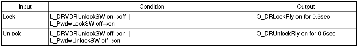 (11) After Unlock condition, and if the condition is not kept for 0.5sec, perform O_DR Unlock Rly=on However, after L_DRV DR Unlock SW or L_AST DR Unlock SW is meeting with the condition by Unlock->Lock and after 0.5sec, and if Key In=off do not perform O_DR Unlock Rly=on