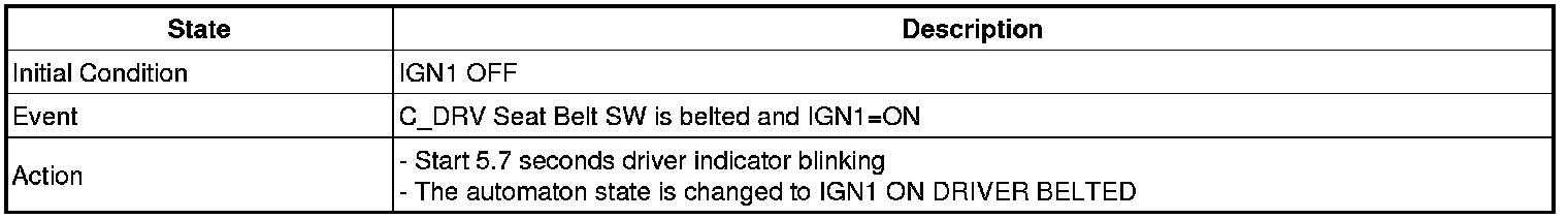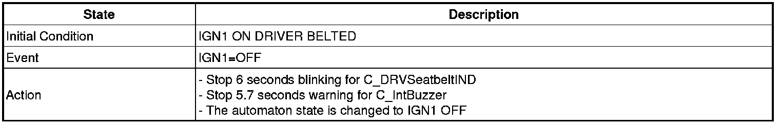 5. Seat belt fastened->unfastened when IGN1=ON state : if vehicle speed over 10Km/h,1time output. And if vehicle speed 5 - 10Km/h, Warning lamp for 1sec (DUTY 50%) and Chime buzzer for 6 every 1s. If vehicle speed less than 5Km/h, Warning lamp for 6 every 1sec (DUTY 50%)