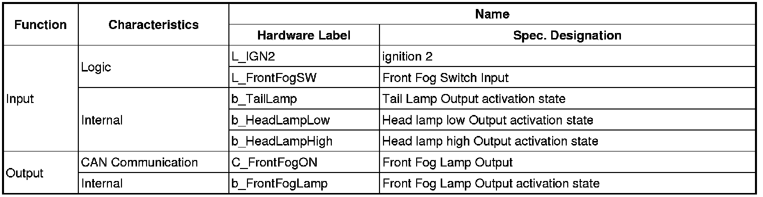 (1) In case of (IGN2=ON) & (Head Lamp Low=ON) & (Head Lamp High=Off), if Front fog lamp switch input is detected (Front Fog SW=On), Front fog lamp output (Front Fog ON=On) is turned ON.