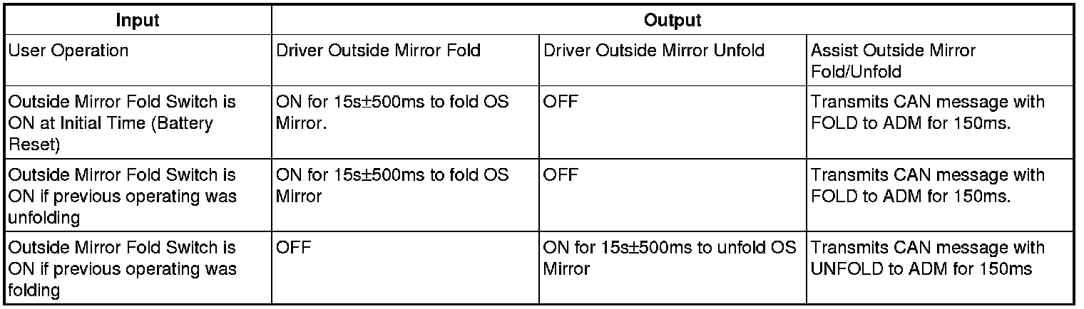 DDM controls the operating condition (Enable or Disable) of the Outside Mirror Folding as follows. Outside Mirror Folding can be controlled by user under operating condition that is in ENABLE, TIMER, and TIMER EXTEND.
