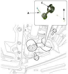 16. Loosen the bolt (A-2ea) and then remove the roll rod stopper (B) from the sub frame (C).
