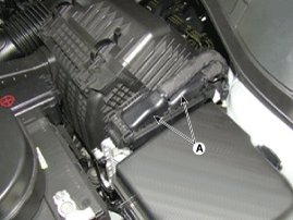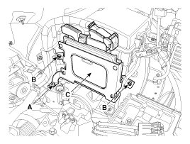 6. After removing the installation nuts (A) and screws (B), remove the ECM (C) from the bracket.