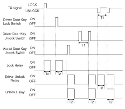(3) Turn Driver Unlock Relay output ON during T2 when receiving TX UNLOCK signal. However, turn Driver Unlock Relay, Unlock Relay (Central Unlock) output during T2 if TX UNLOCK is received within T1.
