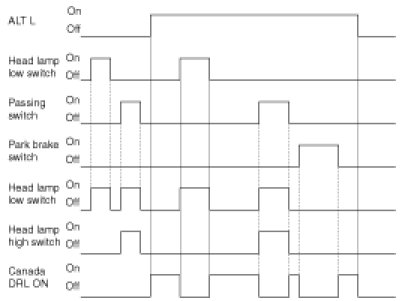 A. If alternator level is high(ALT L=On), BCM activates Canada DRL functionality and turns on the Head lamp high (CANADA DRL=On).