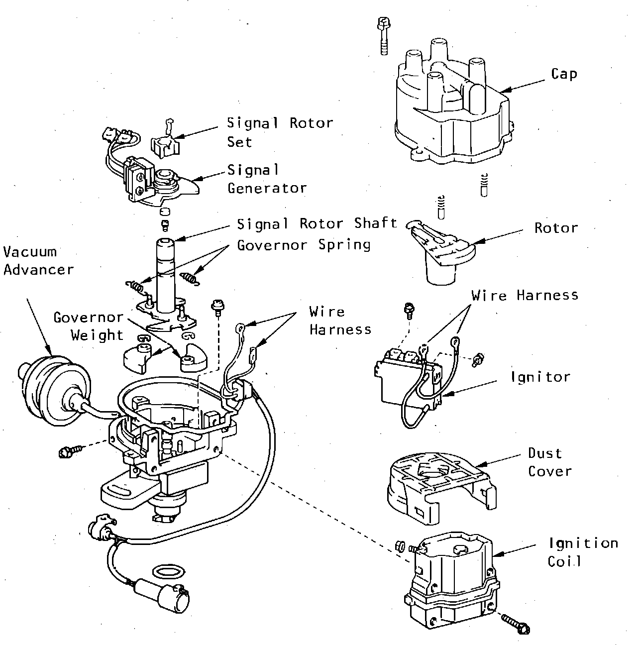 Refer to Fig. 7, during disassembly procedure. 1. Apply alignment marks on distributor and cylinder head, then remove distributor assembly from engine.