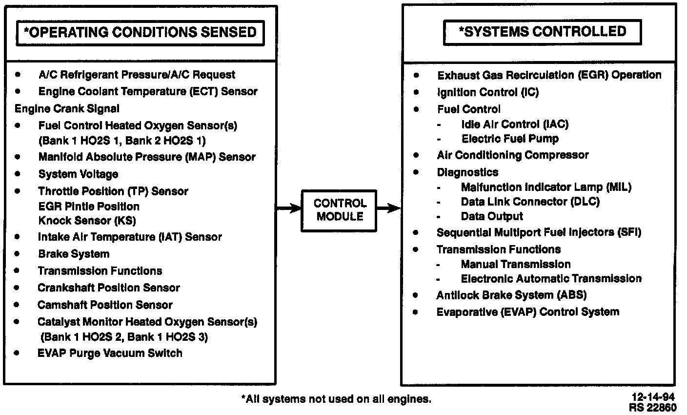 The Powertrain Control Module (PCM) will be referred to as a control module. The control module located on the right hand fender well, is designed to maintain exhaust emission levels to Federal or California standards, while providing excellent driveability and fuel efficiency. The functions of the system are based on data gathered by the sensors and switches located throughout the vehicle. The Powertrain Control Module maintains control over fuel delivery, ignition, idle air flow, the fuel pump and other system components, while monitoring the system for faulty operation with its diagnostic capabilities. The Powertrain Control Module language for communicating the source of the malfunction is a system of diagnostic trouble codes. When it finds a problem, it may illuminate the Malfunction Indicator Lamp (MIL) on the instrument panel and a Diagnostic Trouble Code (DTC) will be stored in the Control Module memory. Which can identify the problem areas to aid the technician in making repairs.