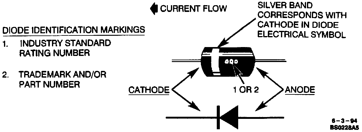 Check current flow direction of the new diode, being sure to install the diode with correct bias. Refer the image for replacement diode symbols and current flow explanations. Attach the new diode to the wire(s) using 60/40 rosin core solder. Use a beat sink (aluminum alligator clip) attached across the diode wire ends to protect the diode from excess heat. Follow the manufacturer's instructions for the soldering equipment you are using.