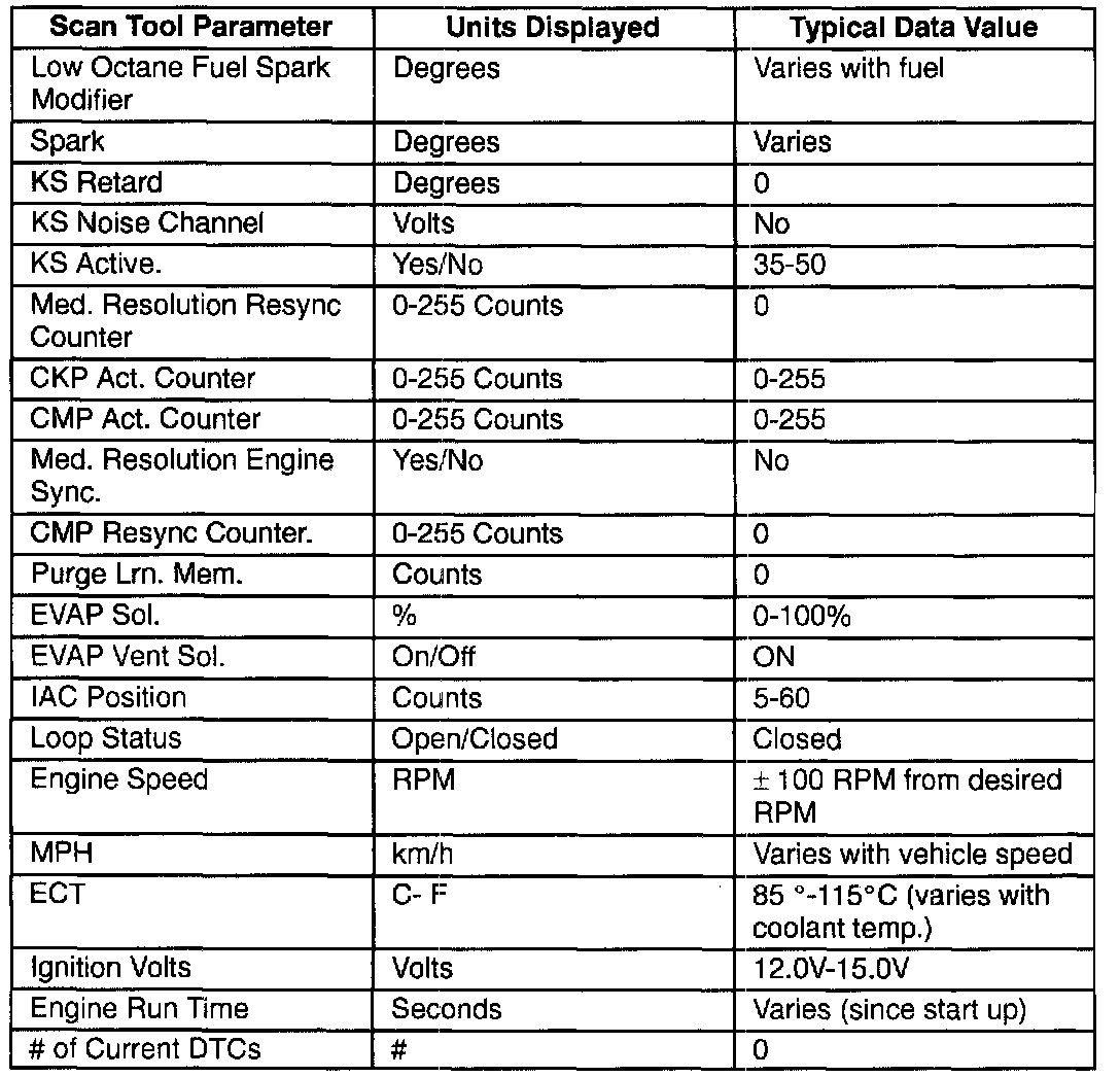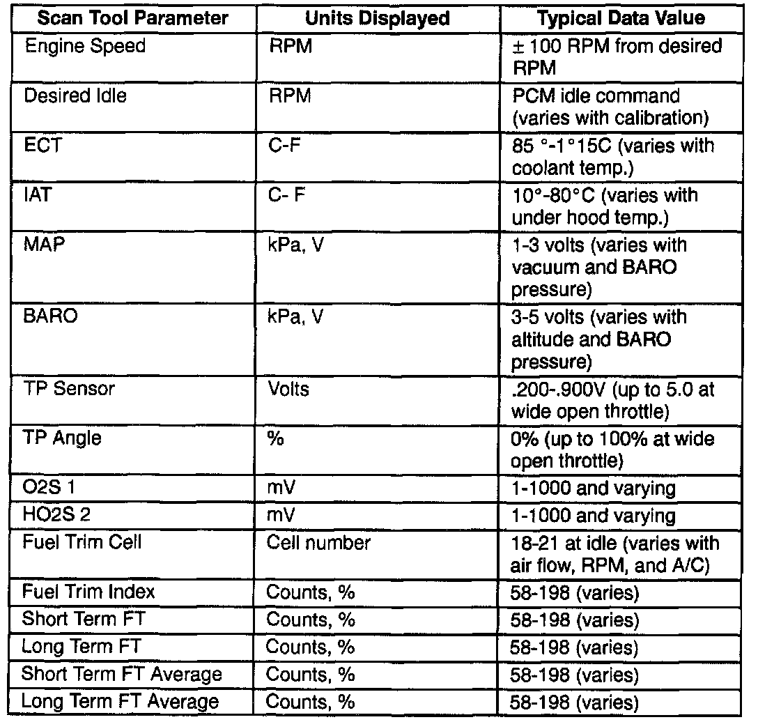 Scan Tool Data - Engine 1 Idle/Upper Radiator Hose Hot/Closed throttle/Park or Neutral/"Closed Loop"/ACC. "OFF"(2 Of 2):