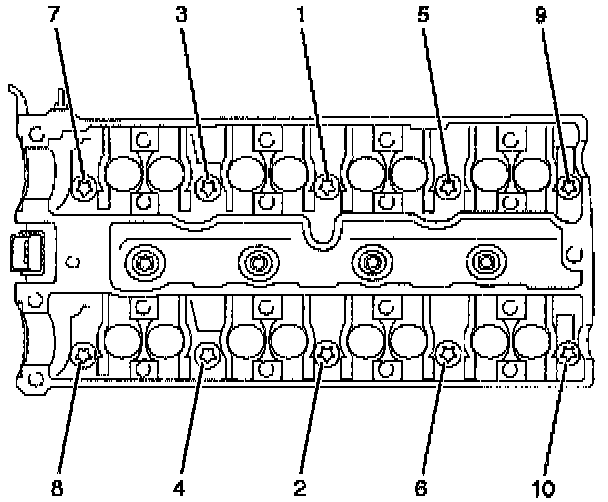 Tighten cylinder head bolts by the four step tightening method. Tighten to the specified torque.