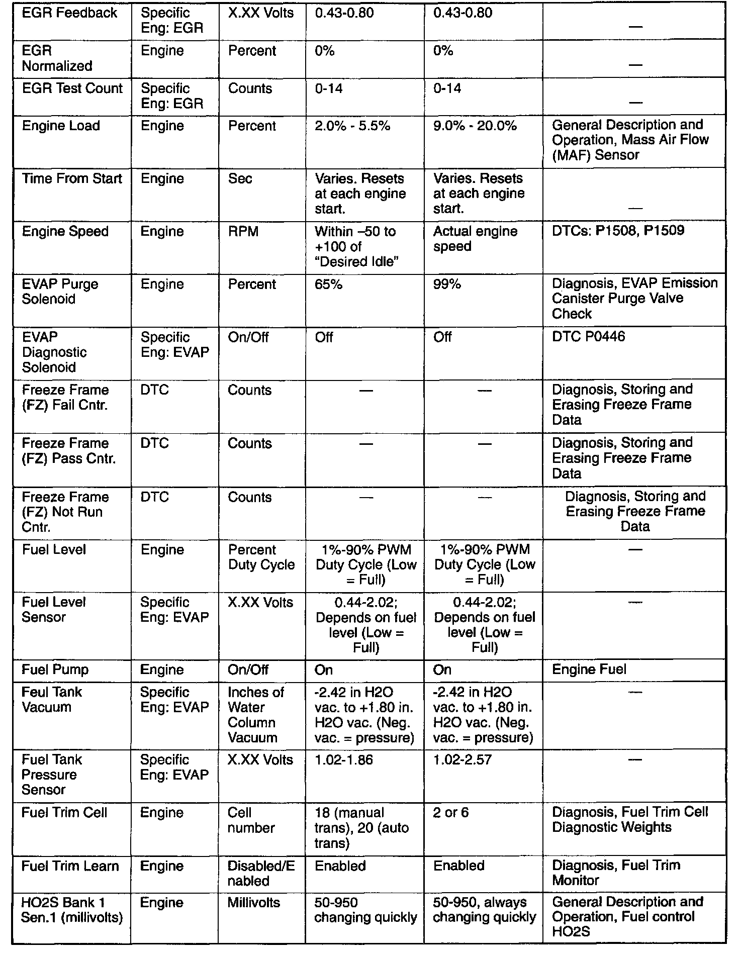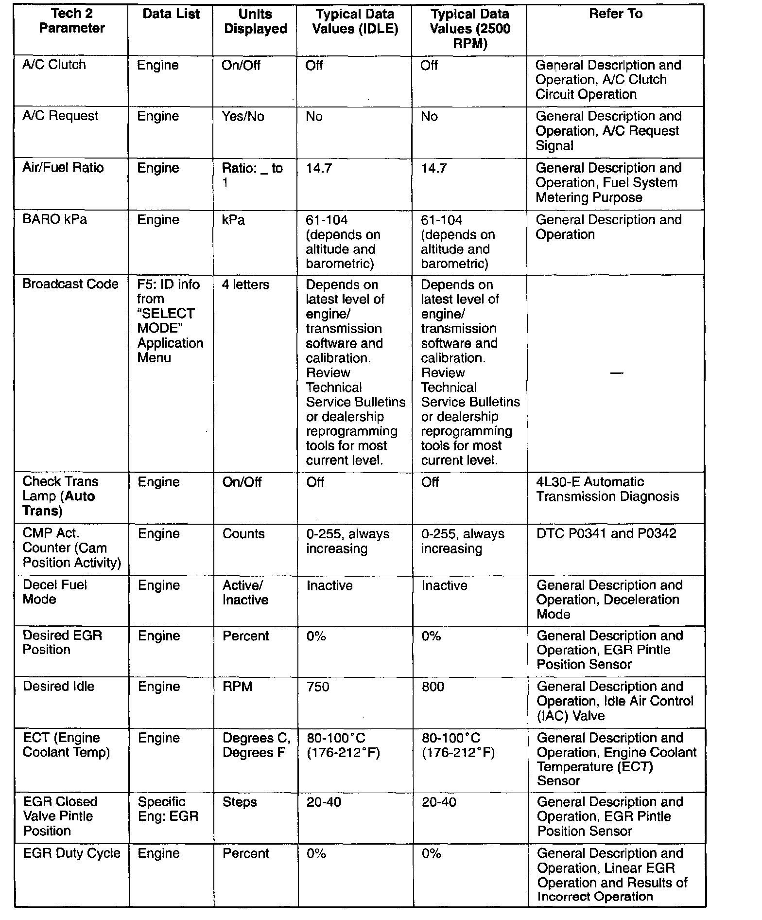 Use the Typical Scan Data Values Table only after the On-Board Diagnostic System Check has been completed, no DTC(s) were noted, and you have determined that the on-board diagnostics are functioning properly. Scan tool values from a properly-running engine may be used for comparison with the engine you are diagnosing. The typical scan data values represent values that would be seen on a normally-running engine.