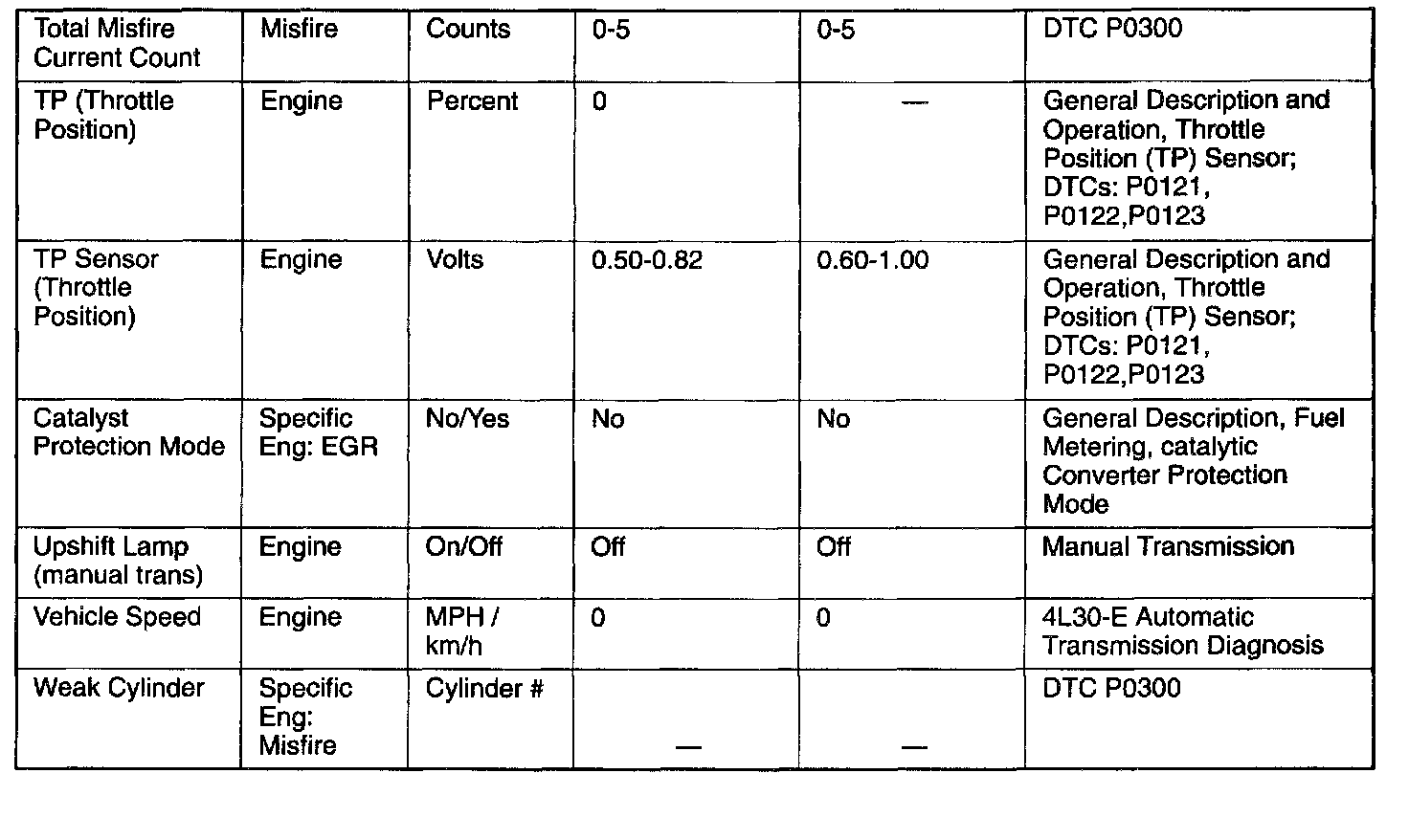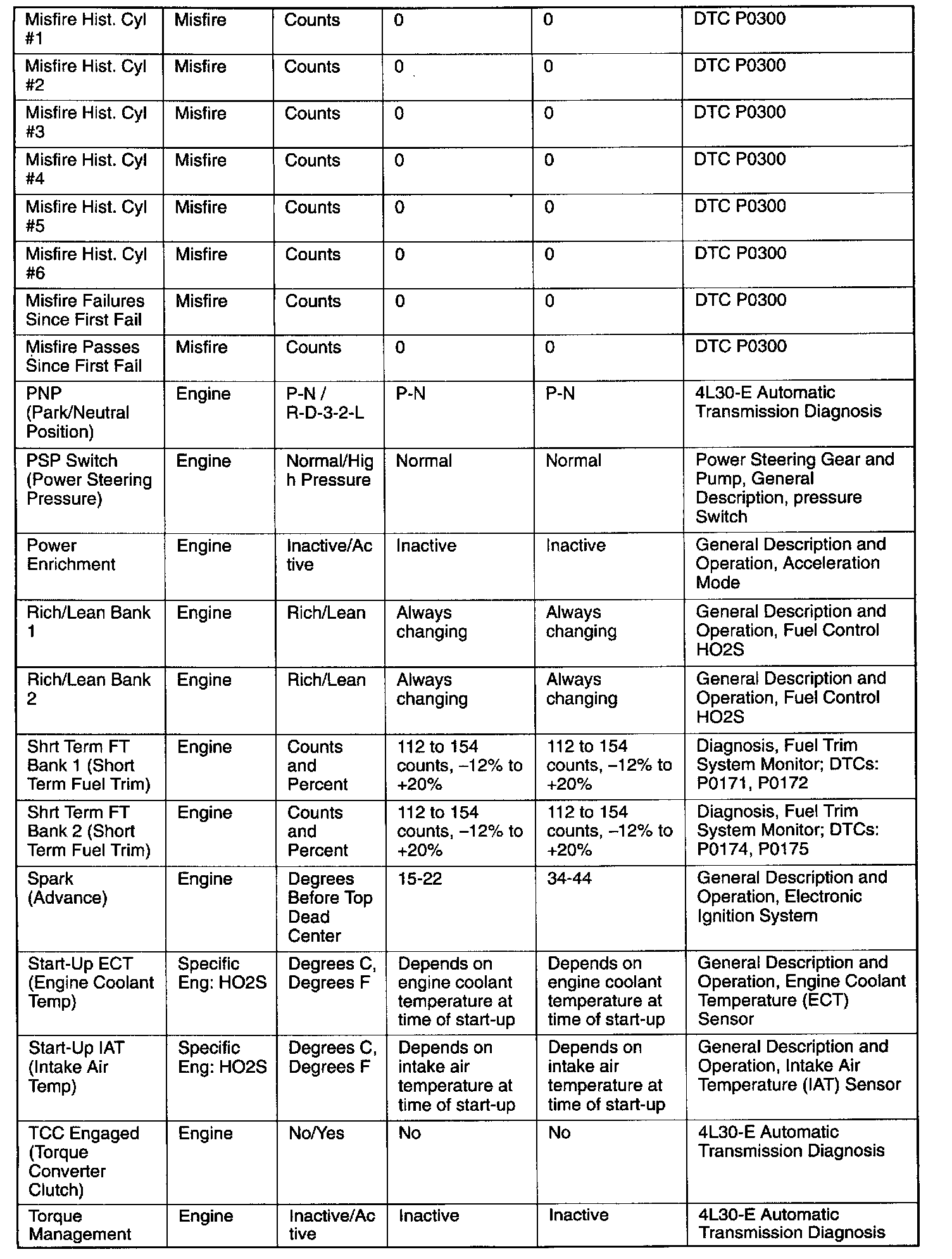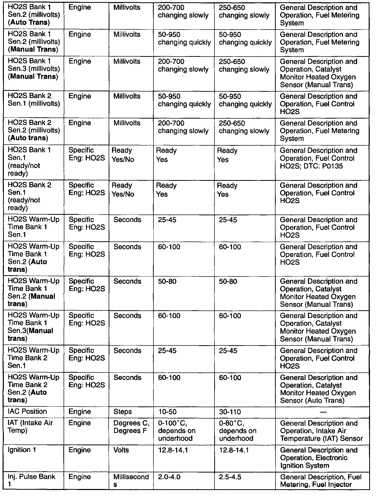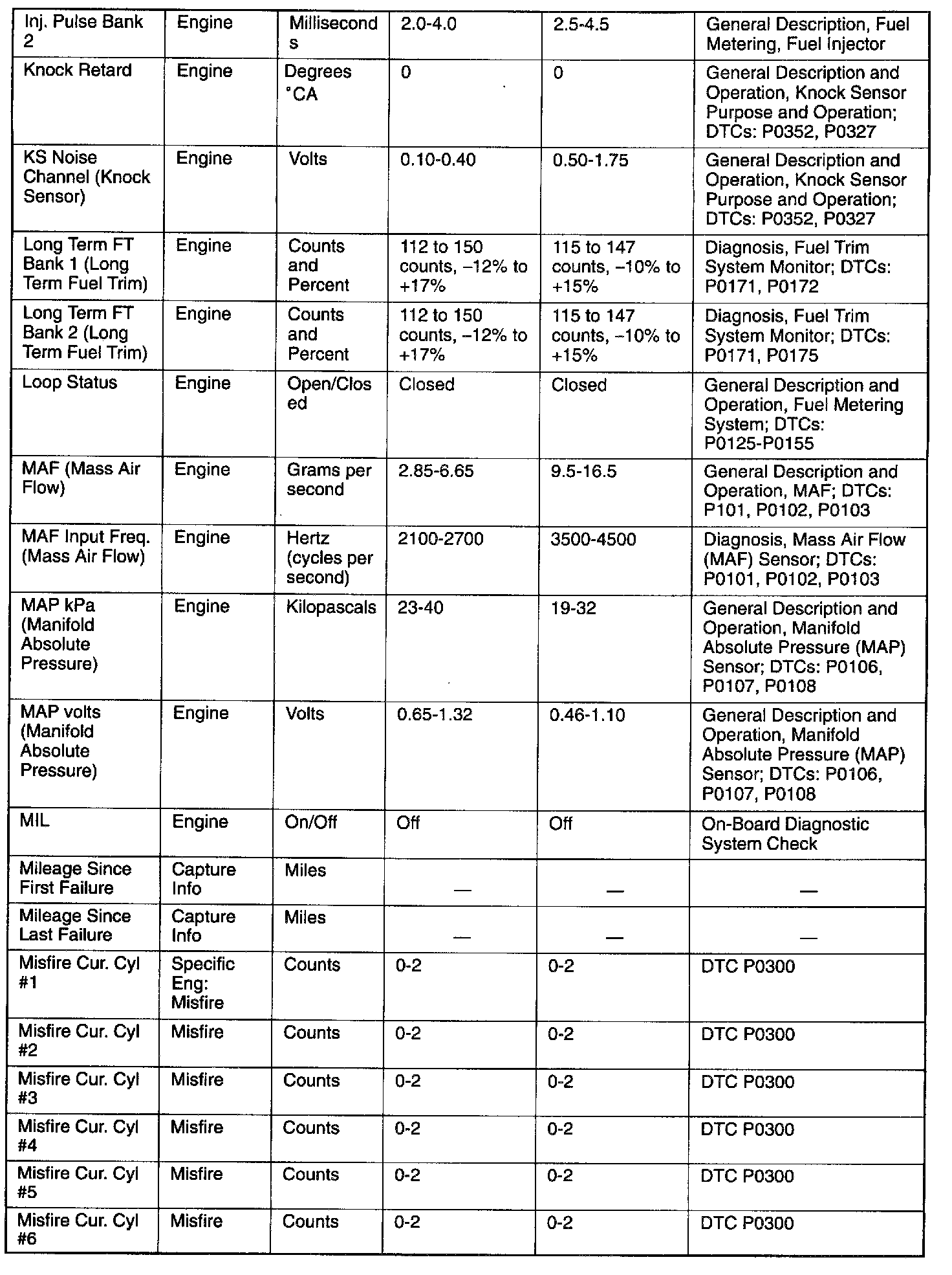 Only the parameters listed below are referred to in this service manual for use in diagnosis. For further information on using the scan tool to diagnose the PCM and related sensors, refer to the applicable reference section listed below. If all values are within the typical range described below, refer to the Symptoms section for diagnosis.