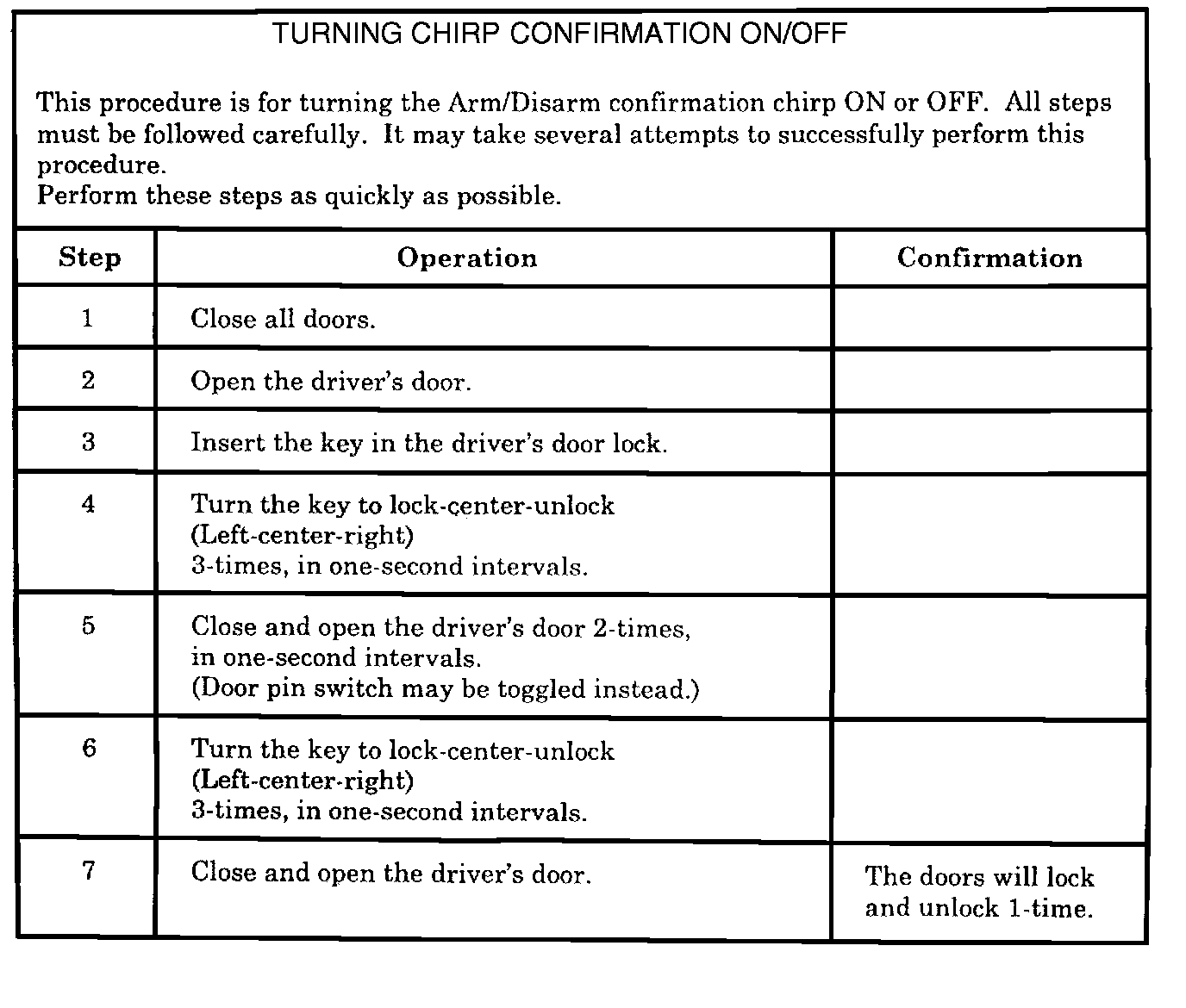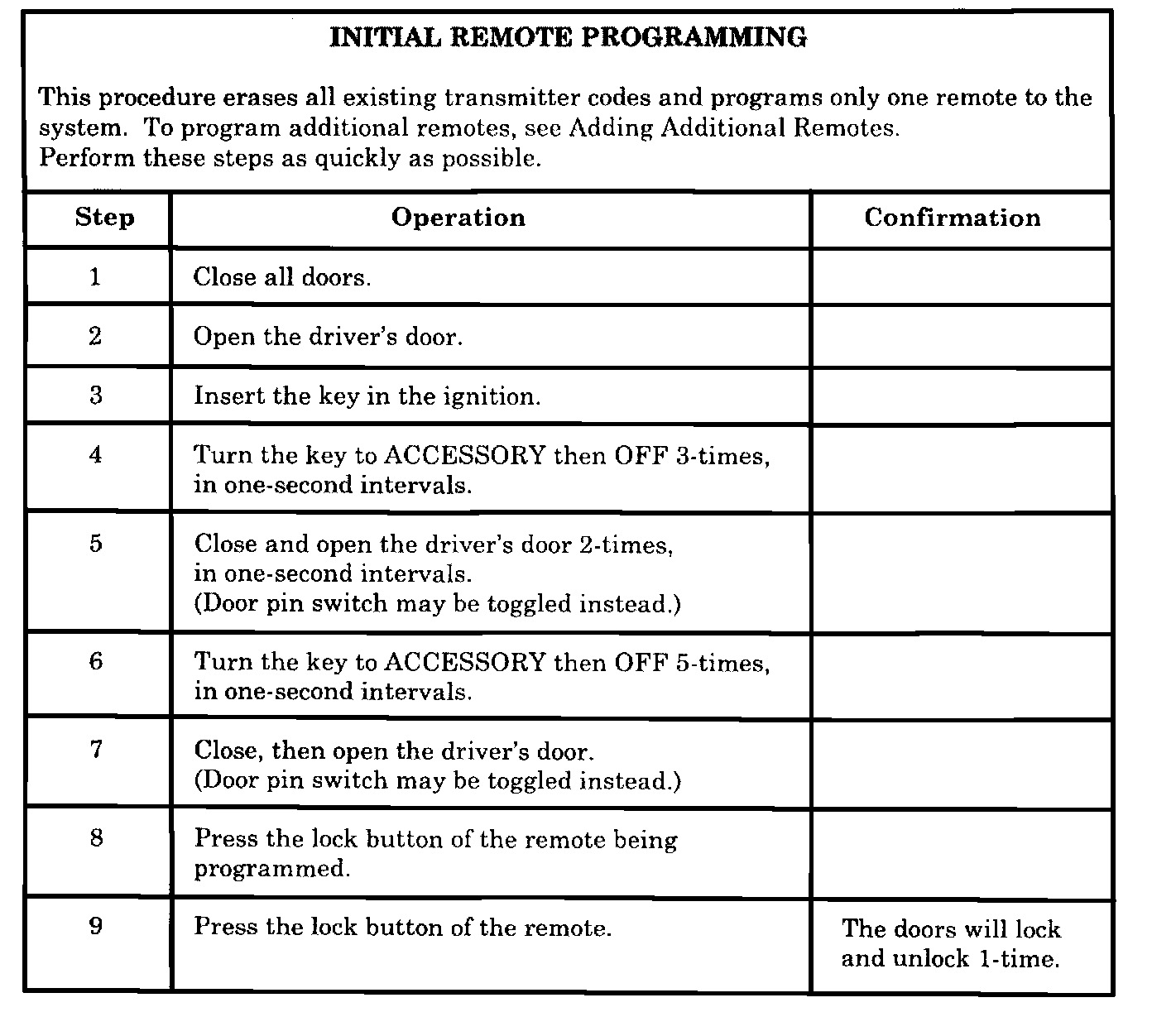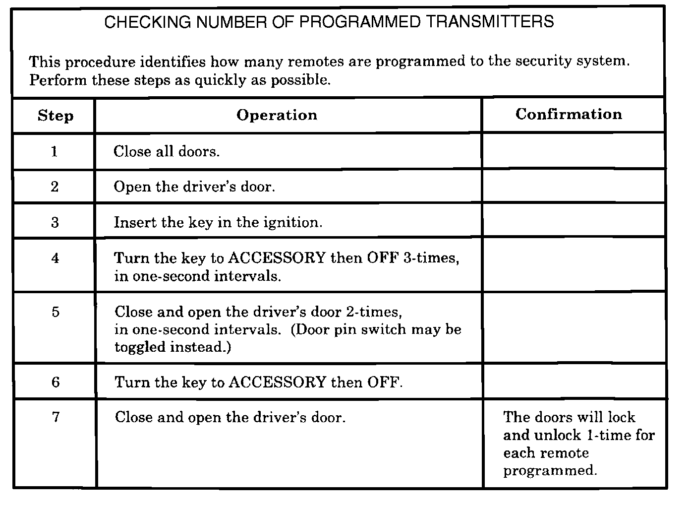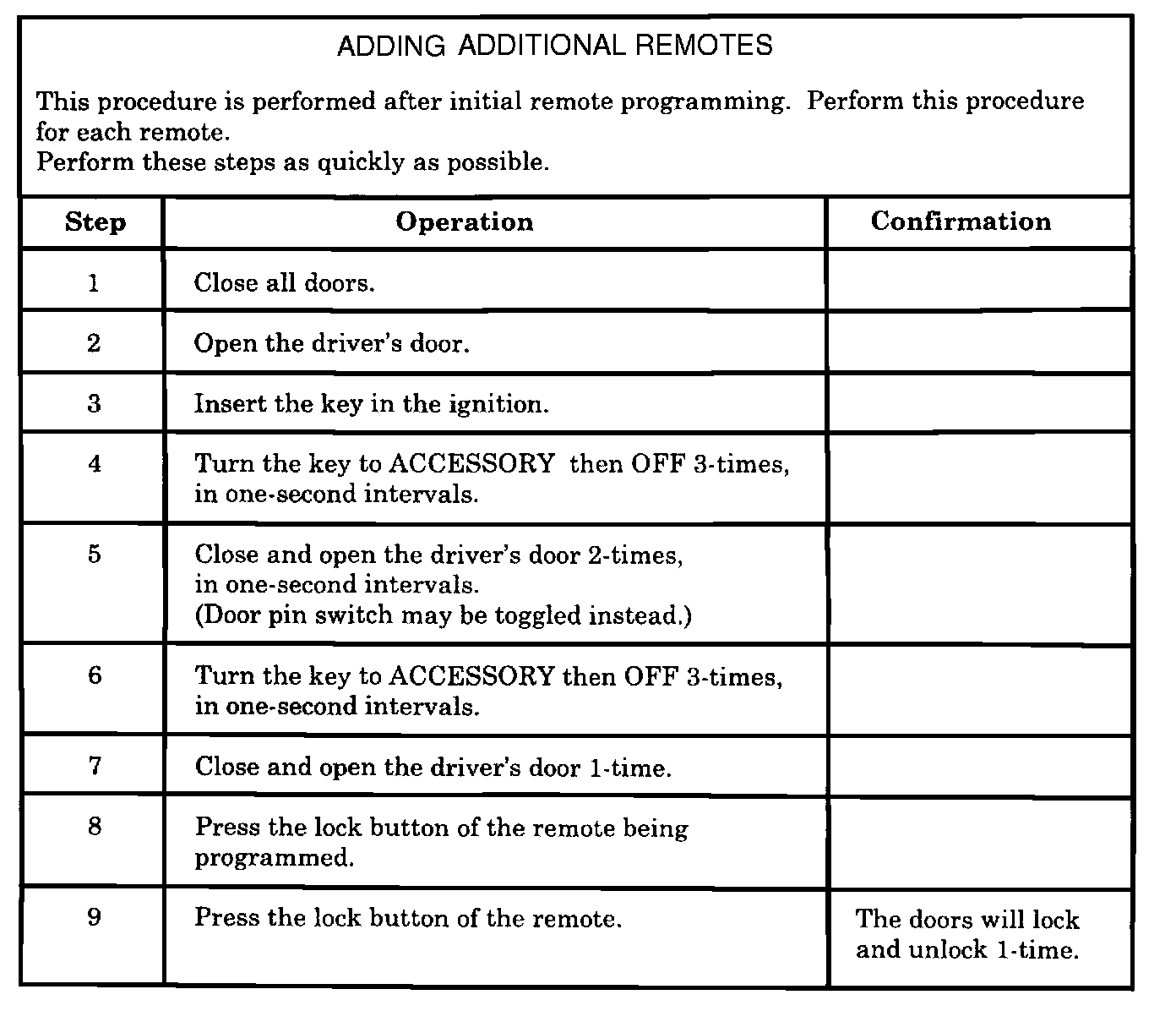 Included in this bulletin are proper procedures for reprogramming the Genuine Isuzu remote keyless entry/security system. There are several programming functions of the system. The following quick reference charts are provided for these functions: