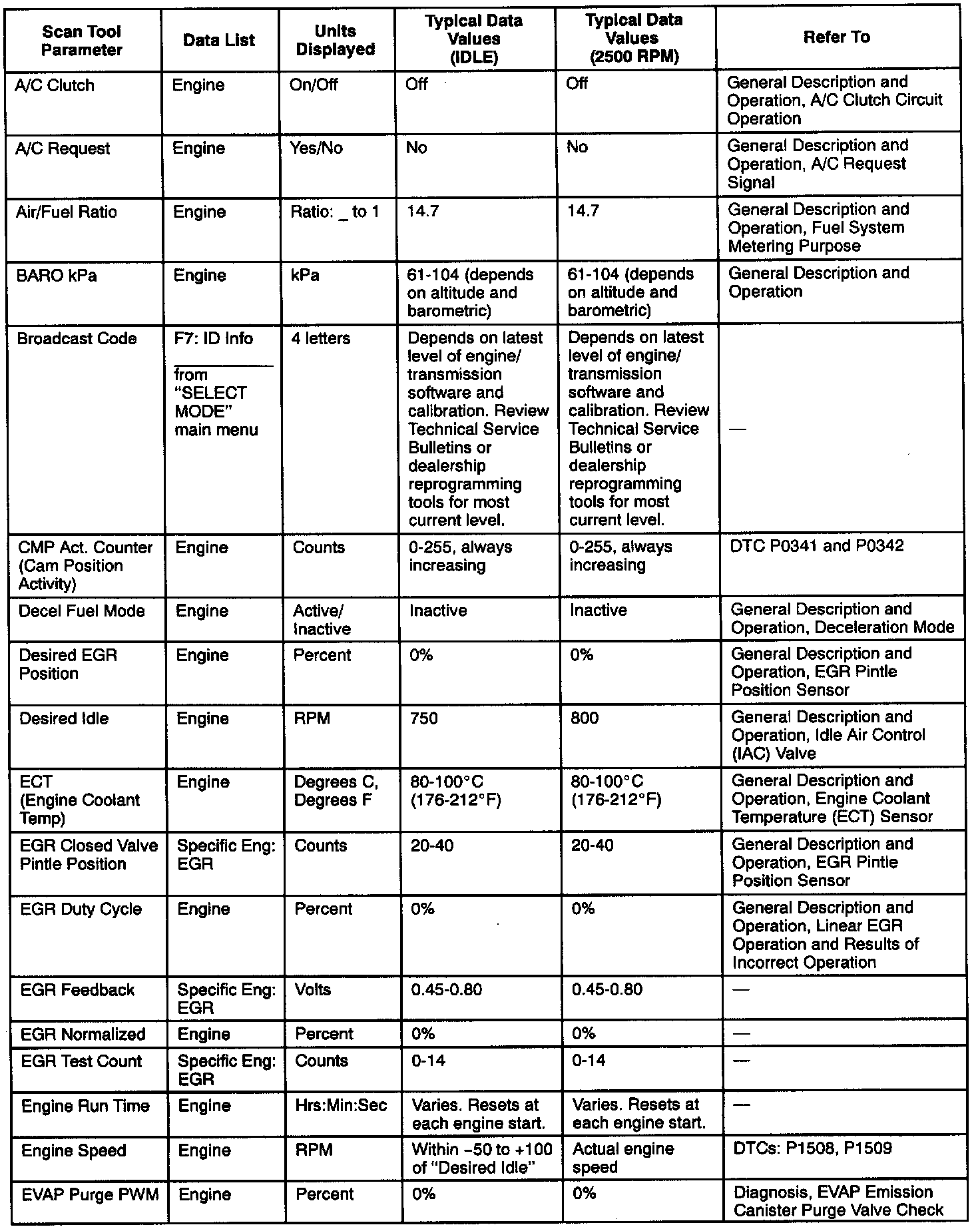 Use the Typical Scan Data Values Table only after the On-Board Diagnostic System Check has been completed, no DTC(s) were noted, and you have determined that the on-board diagnostics are functioning properly. Scan Tool values from a properly-running engine may be used for comparison with the engine you are diagnosing. The typical scan data values represent values that would be seen on a normally-running engine.
