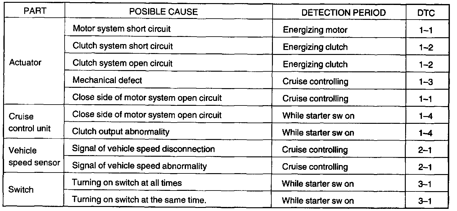 The cruise control unit uses the cruise main indicator light and diagnosis the failure, when the control unit detects abnormality on the table.