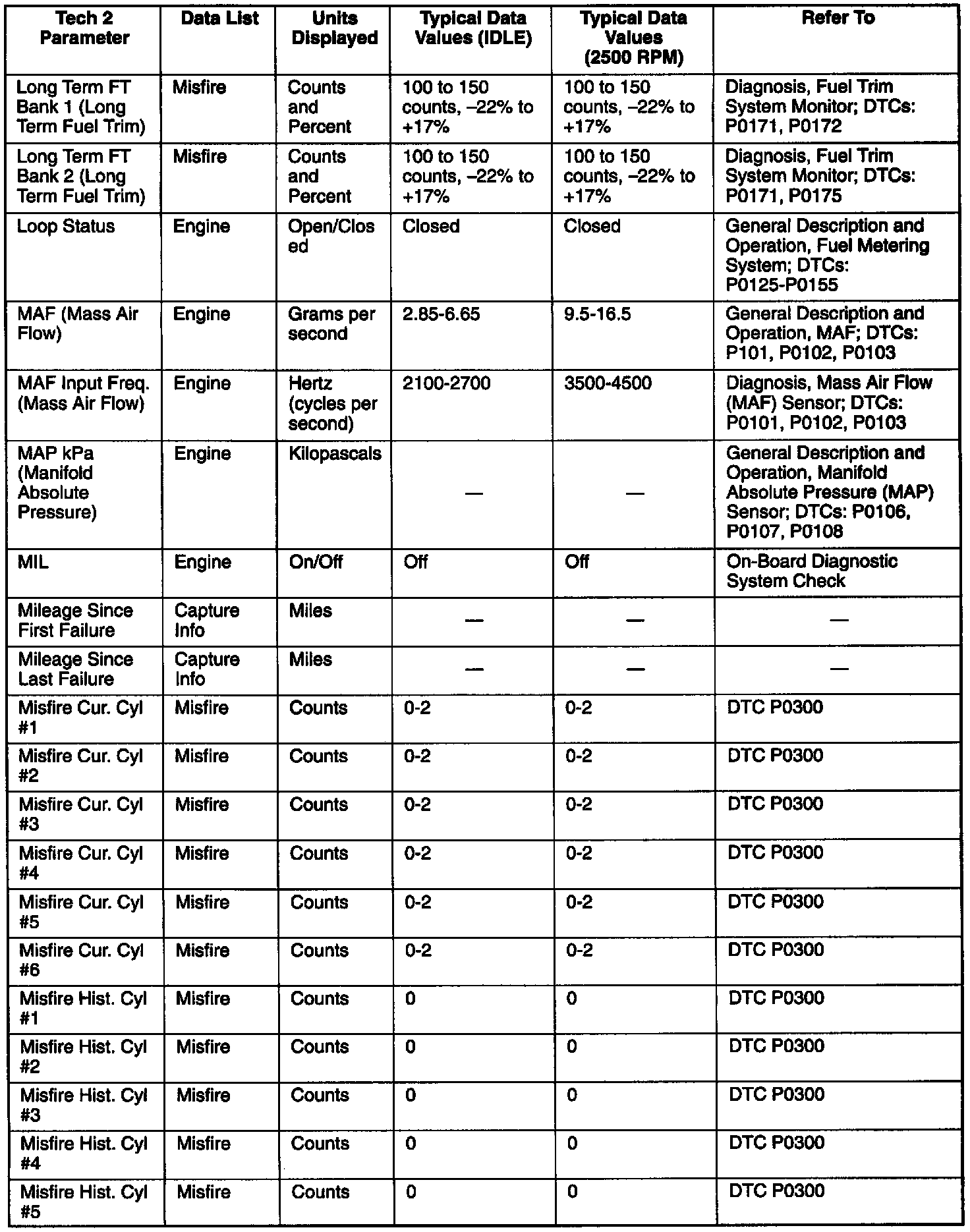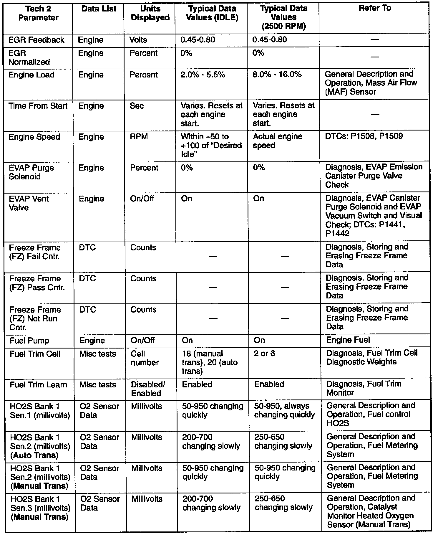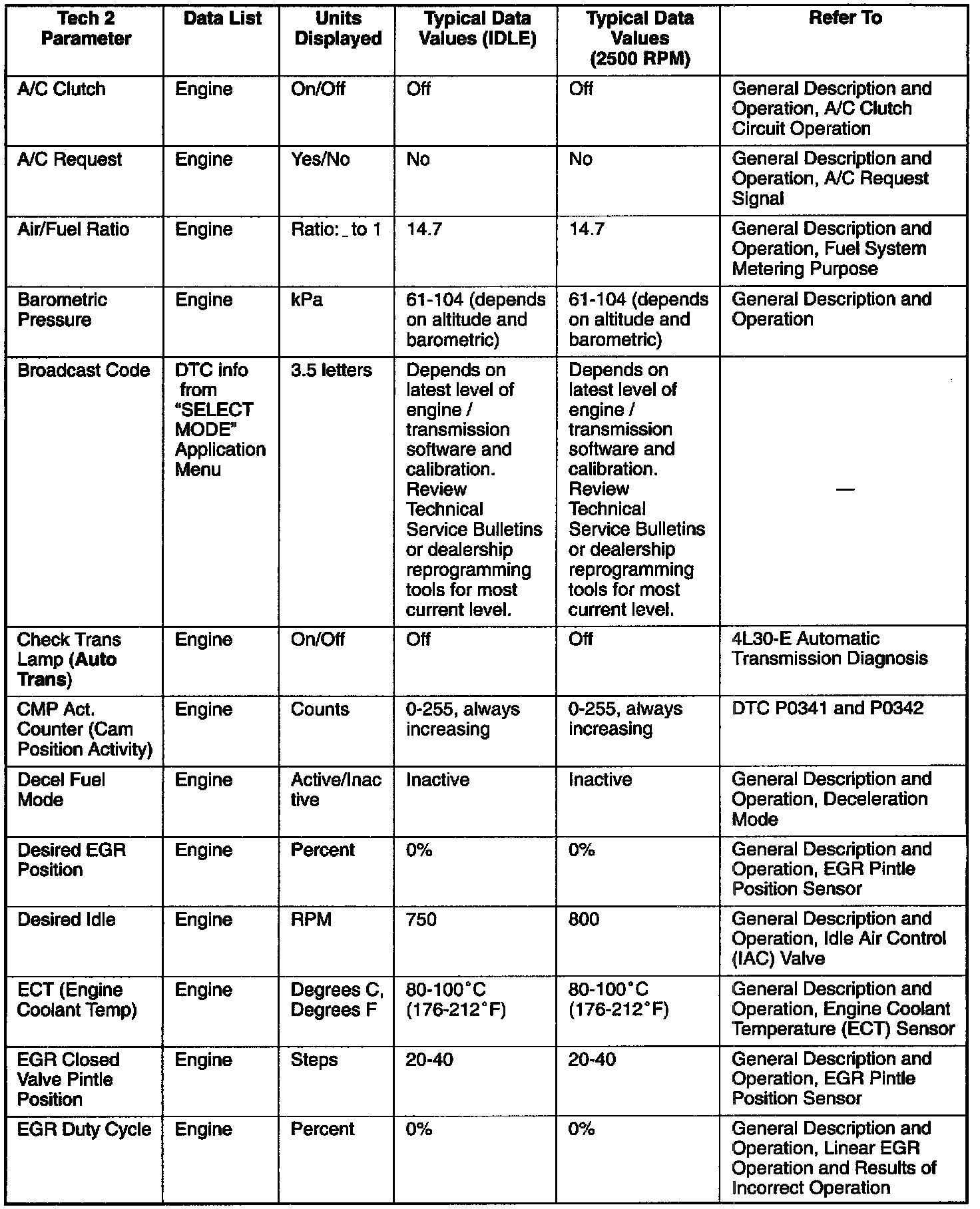 Use the Typical Scan Data Values Table only after the On-Board Diagnostic System Check has been completed, no DTC(s) were noted, and you have determined that the on-board diagnostics are functioning properly. Scan tool values from a properly-running engine may be used for comparison with the engine you are diagnosing. The typical scan data values represent values that would be seen on a normally-running engine.