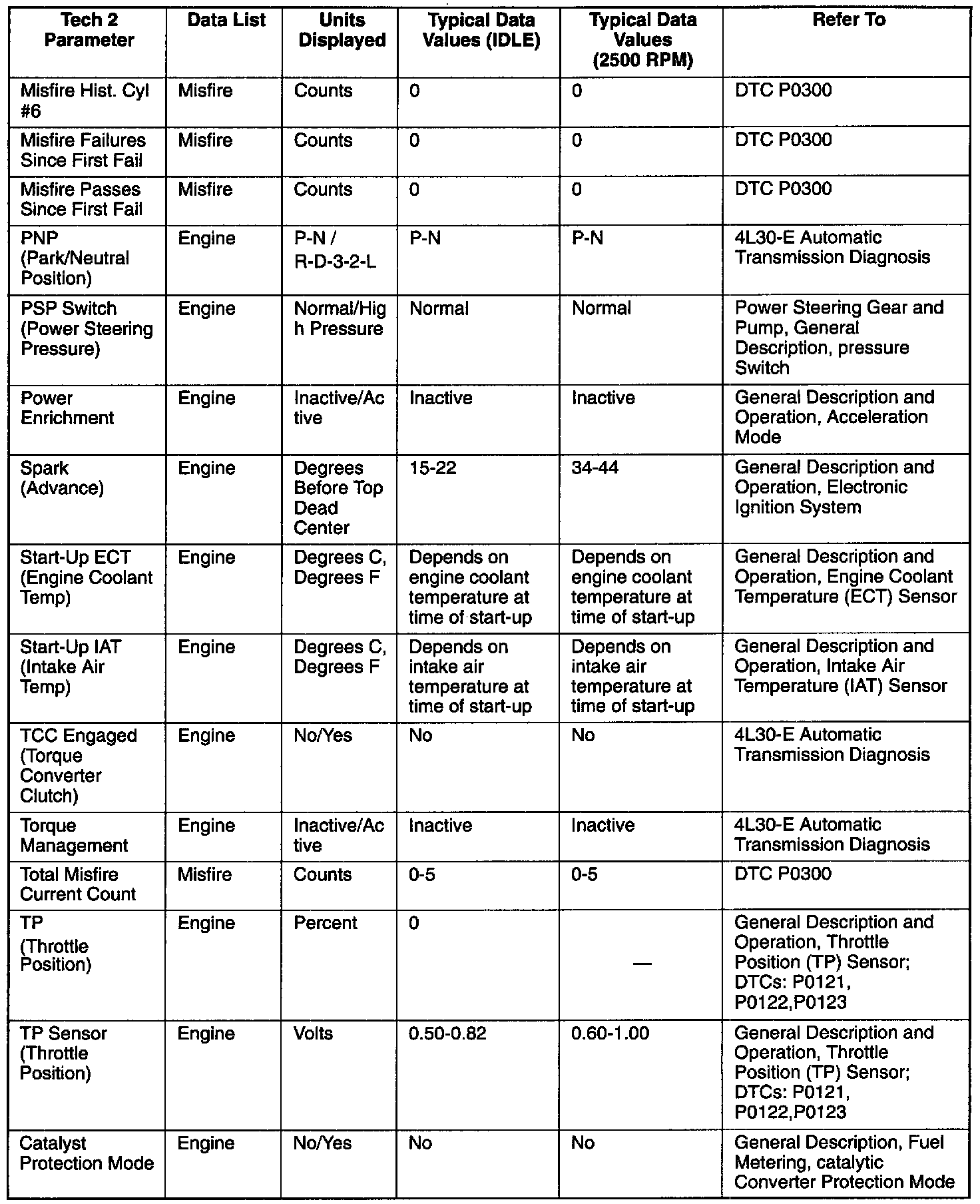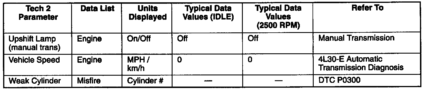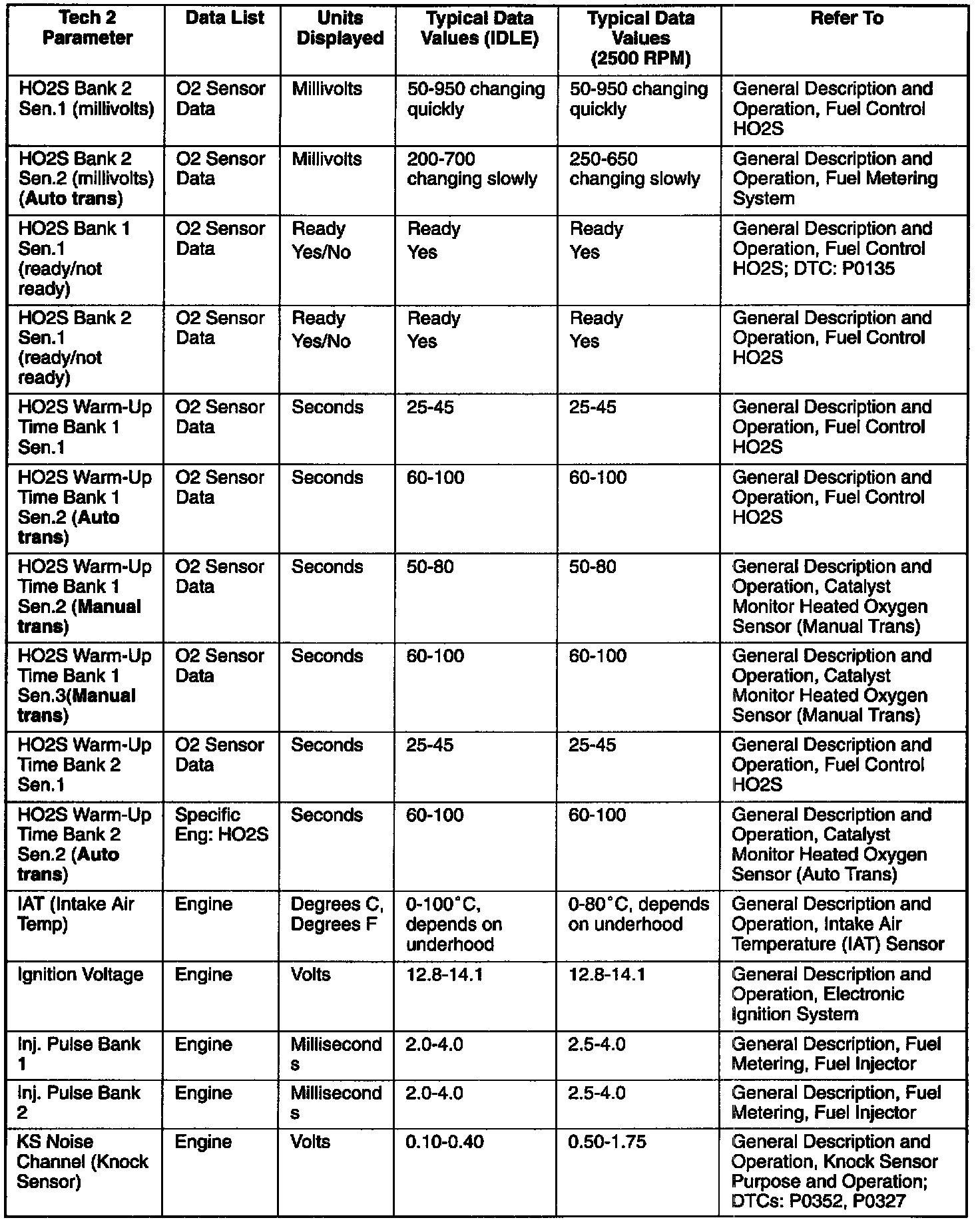 Use the Typical Scan Data Values Table only after the On-Board Diagnostic System Check has been completed, no DTC(s) were noted, and you have determined that the on-board diagnostics are functioning properly. Scan tool values from a properly-running engine may be used for comparison with the engine you are diagnosing. The typical scan data values represent values that would be seen on a normally-running engine.