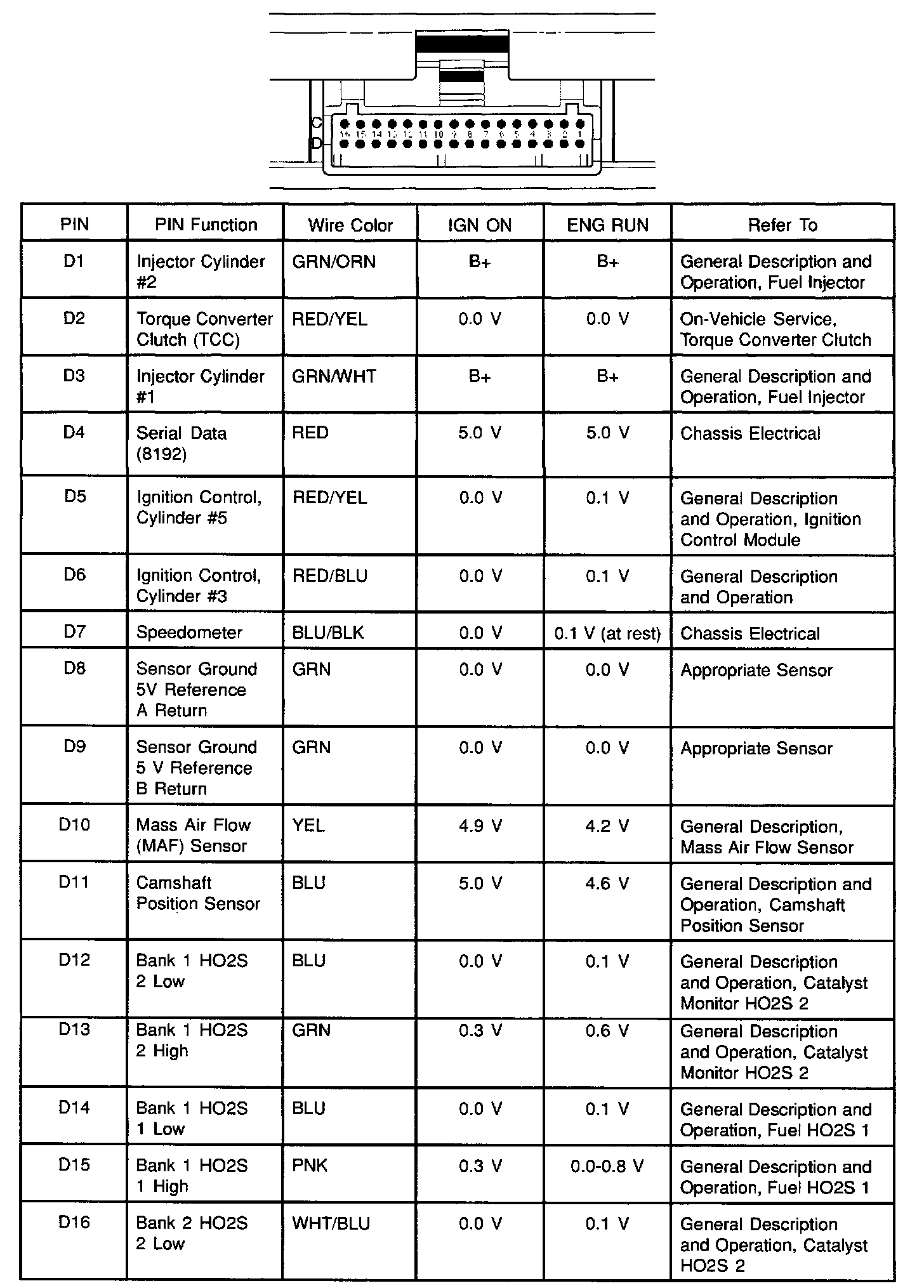 PCM Pinout Table, 32-Way White Connector - Row D: