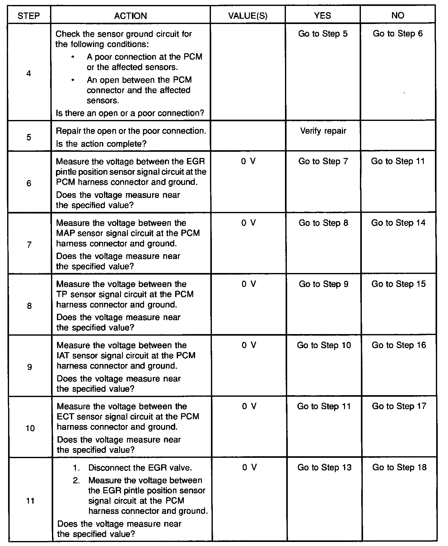 11-15. If a sensor input circuit has been shorted to voltage, ensure that the sensor has not been damaged. A damaged IAT or ECT sensor will continue to indicate a high voltage or a low temperature after the affected circuit has been repaired. A damaged TP, MAP, fuel tank pressure, or EGR pintle position sensor will indicate a high voltage, a low voltage, or a fixed value after the affected circuit has been repaired. If the sensor has been damaged, replace it.