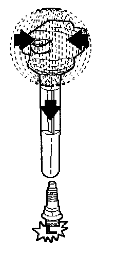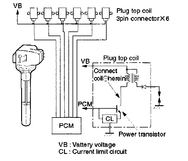 The PCM applies 5V signal voltage to the ignition coil requiring ignition. This signal sets on the power transistor of the ignition coil to establish a grounding circuit for the primary coil, applying battery voltage to the primary coil. At the ignition timing, the PCM stops sending the 5V signal voltage. Under this condition the power transistor of the ignition coil is set oft to cut the battery voltage to the primary coil, thereby causing a magnetic field generated in the primary coil to collapse. On this moment a line of magnetic force flows to the secondary coil, and when this magnetic line crosses the coil, high voltage induced by the secondary ignition circuit to flow through the spark plug to the ground.