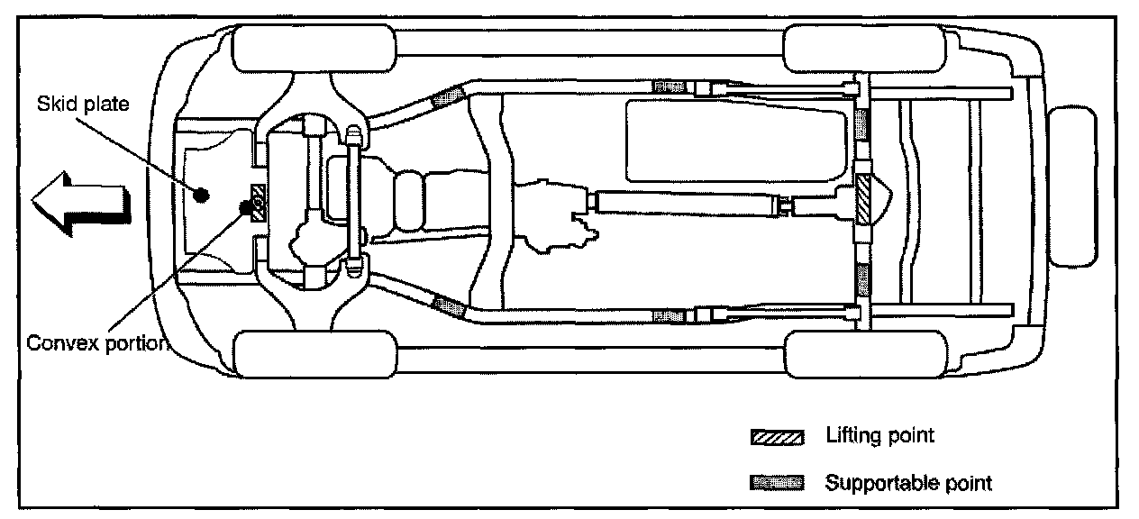 When using a floor jack, lift on the Convex portion of the skid plate.