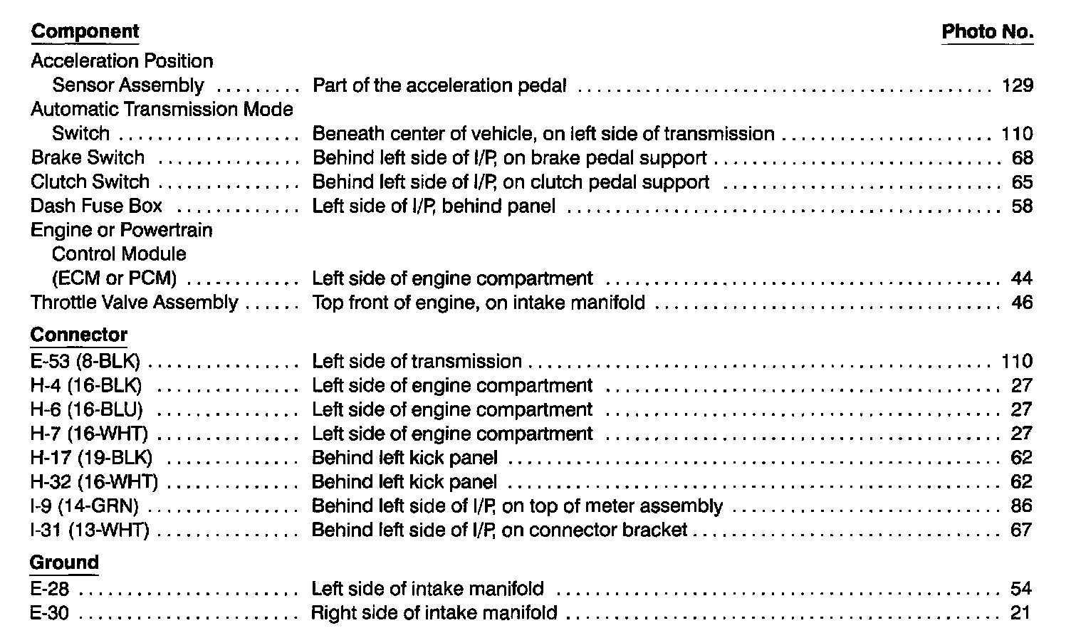 Component Location Index photographs can be found at Component Locations.