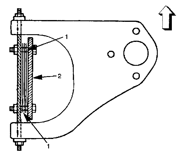 The caster angle can be adjusted by means of the caster shims (1) installed between the chassis frame (2) and fulcrum pins. Caster angle: 2°30' ± 1°