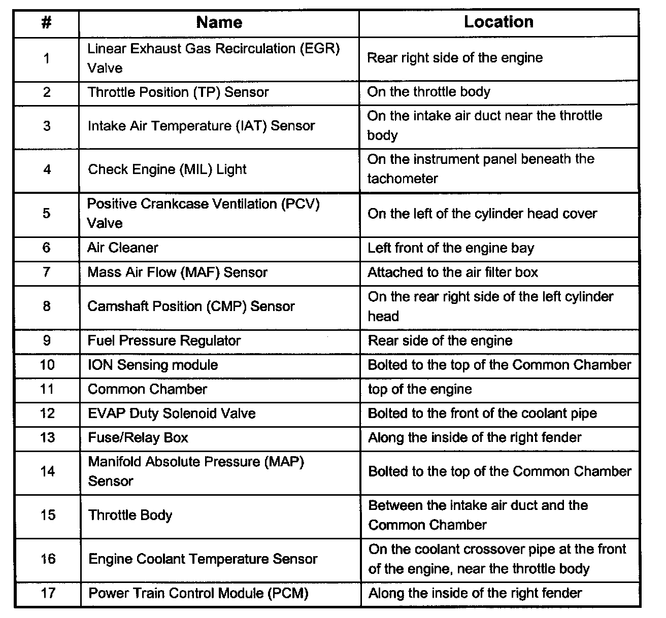 Engine Component Locator Table: