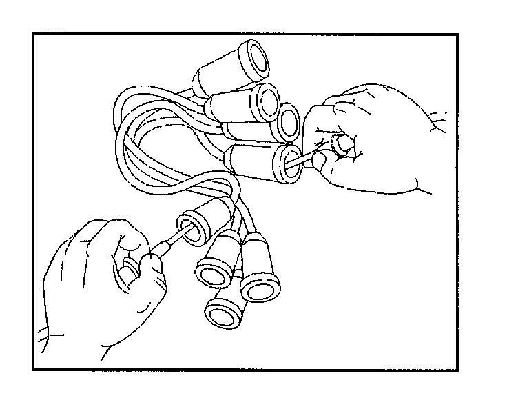 NOTE: Never puncture the spark plug cable's insulation with a needle or the pointed end of a probe into the cable. An increase in resistance would be created which would cause the cable to become defective.