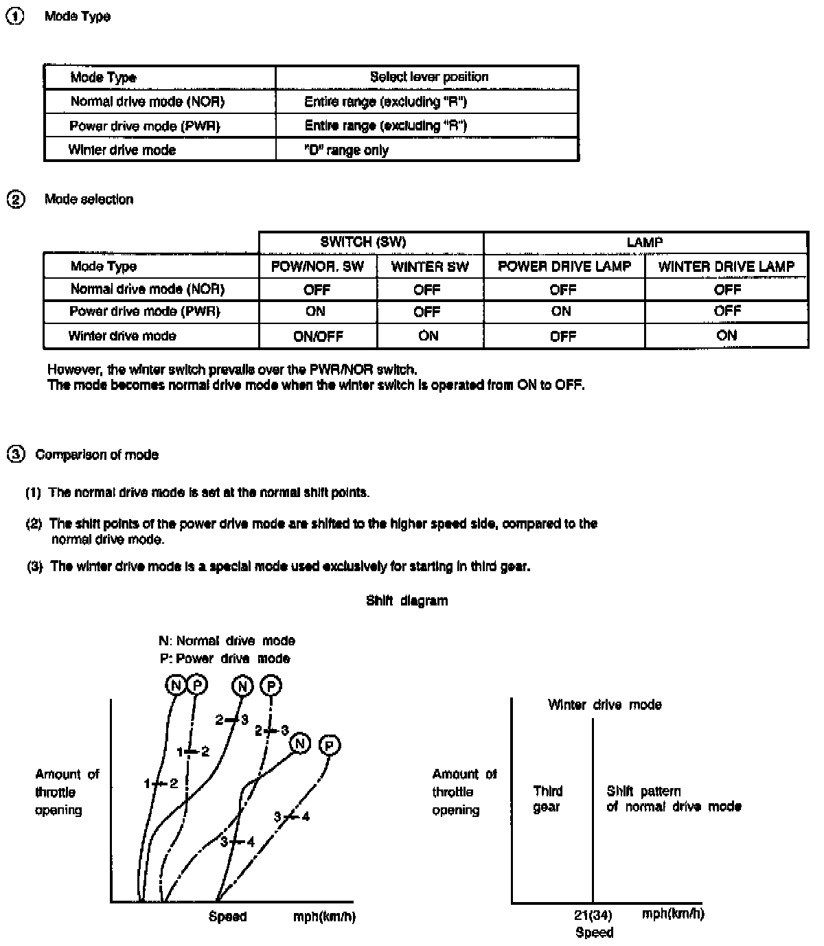 This mode is automatically activated from NORMAL mode only when downhill conditions are recognized. The shift pattern is identical to NORMAL mode except 3-4 and 4-3 shift lines at low throttle modified to get engine braking on a larger speed range.