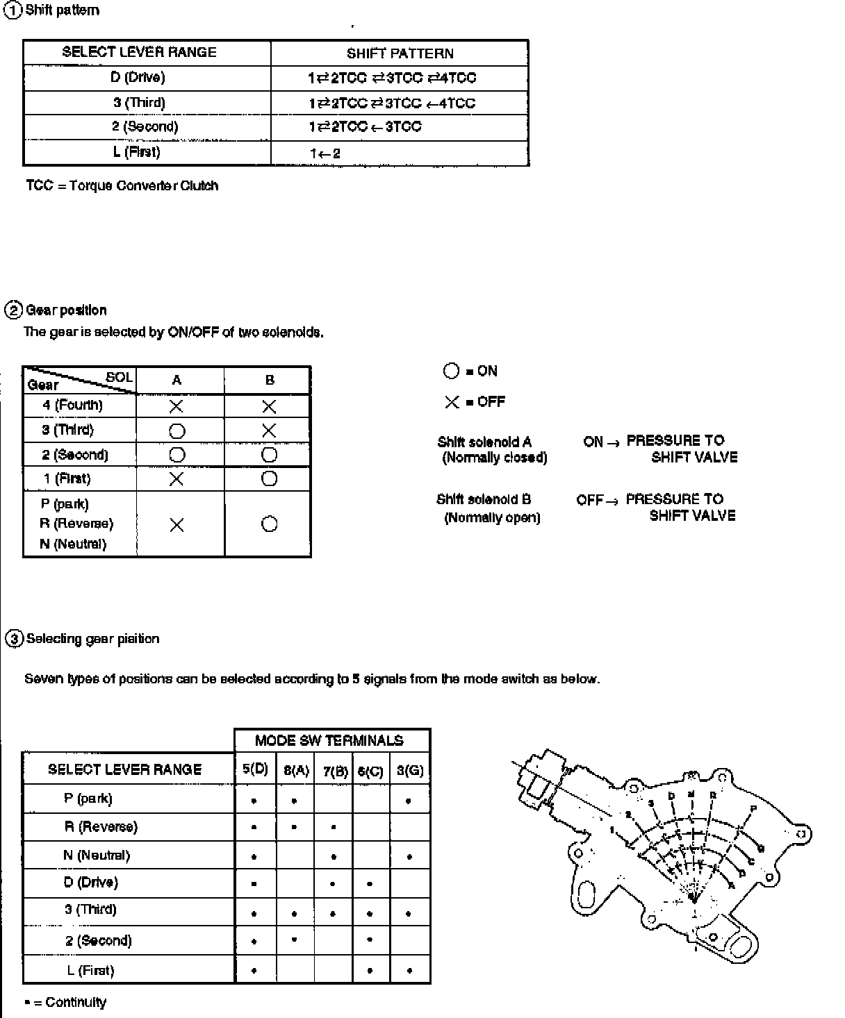 The transmission gear is shifted according to the shift pattern selected by the driver. In shifting gears, the gear ratio is controlled by the ON/OFF signal using the shift solenoid A and the shift solenoid B.