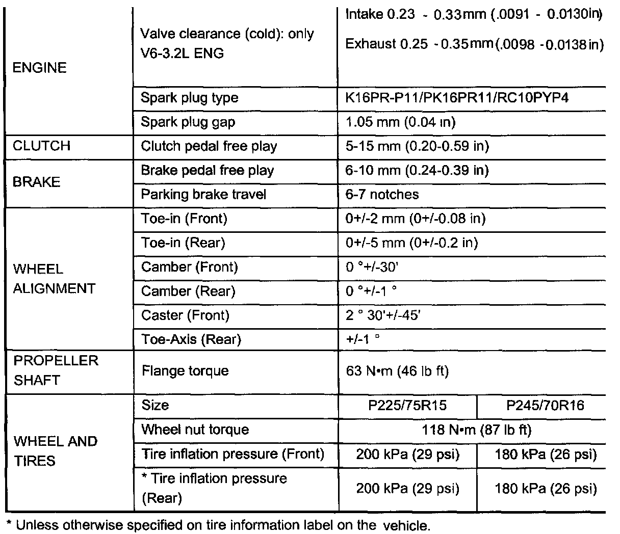 Service Data And Specifications: