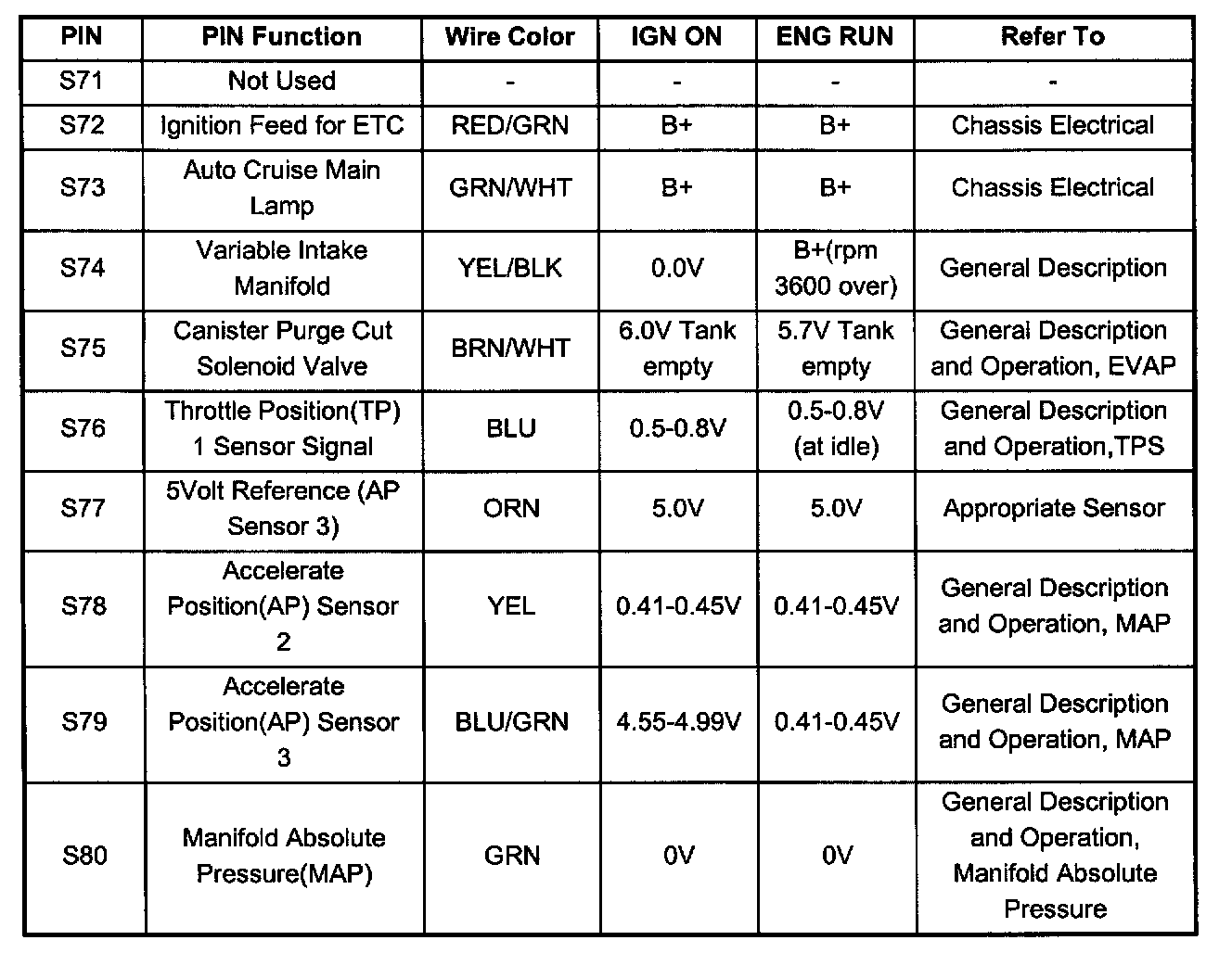 PCM Pinout Table, 80-Way Red Connector - Row "S61 - 80" (S71 To S80):