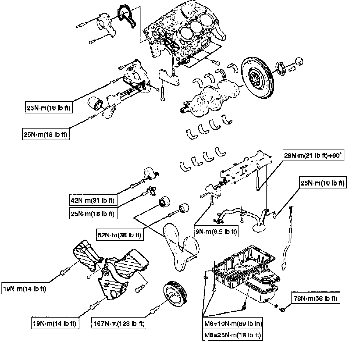 Crankshaft main bearing, Flywheel, Crankcase, Oil pan, Timing belt tensioner, Timing pulley, Timing belt cover, Oil pump, Oil gallery, Oil strainer and water pump