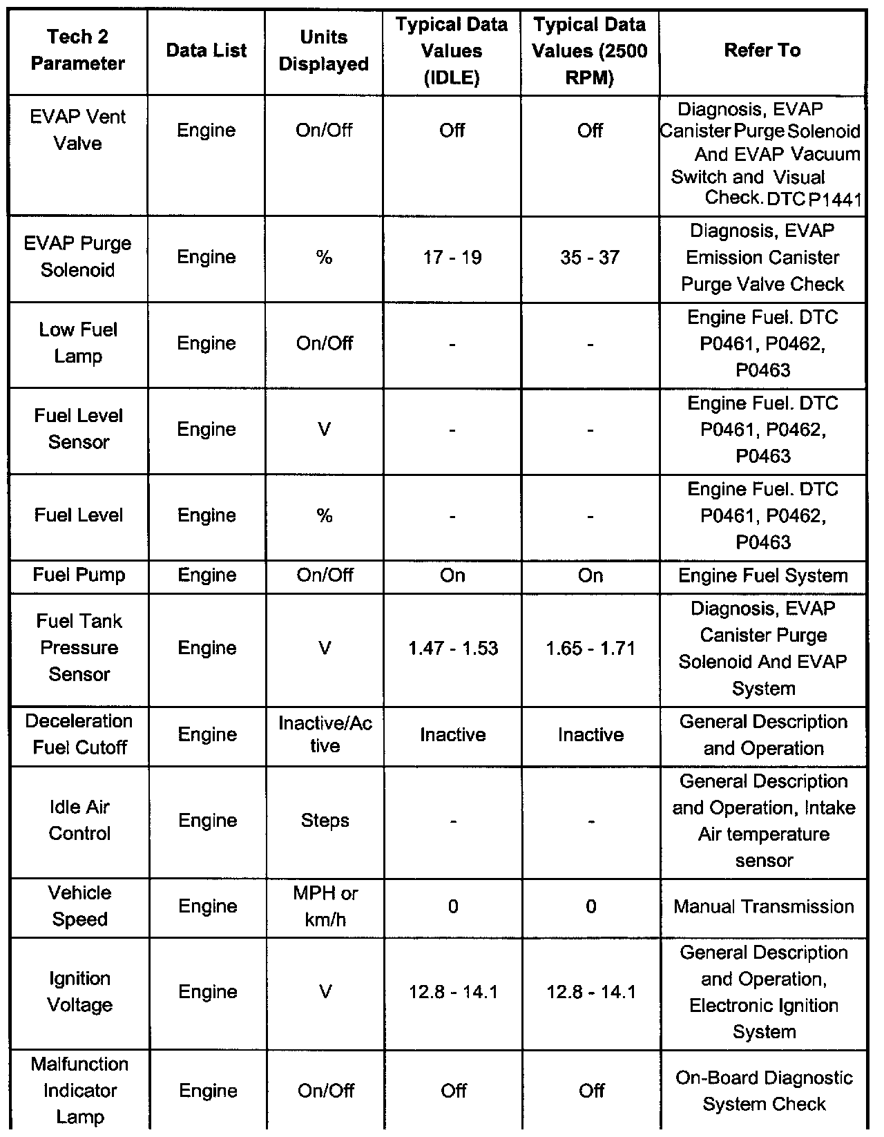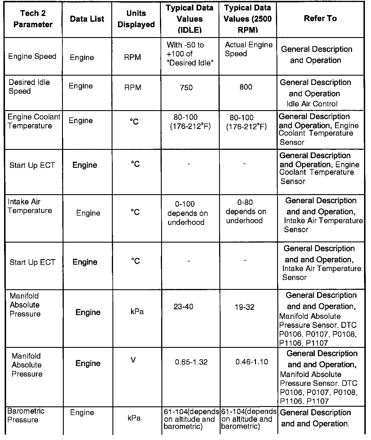 Only the parameters listed below are referred to for use in diagnosis. For further information on using the Tech 2 to diagnose the PCM and related sensors, refer to the applicable listed below. If all values are within the typical range described below, for diagnosis, refer to Diagnosis by Symptom.