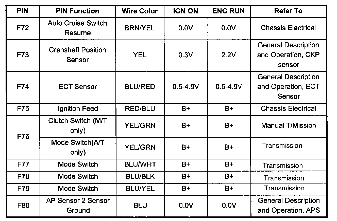 PCM Pinout Table, 80 - Way Blue Connector - Row "F61 - 80" (F72 To F80):