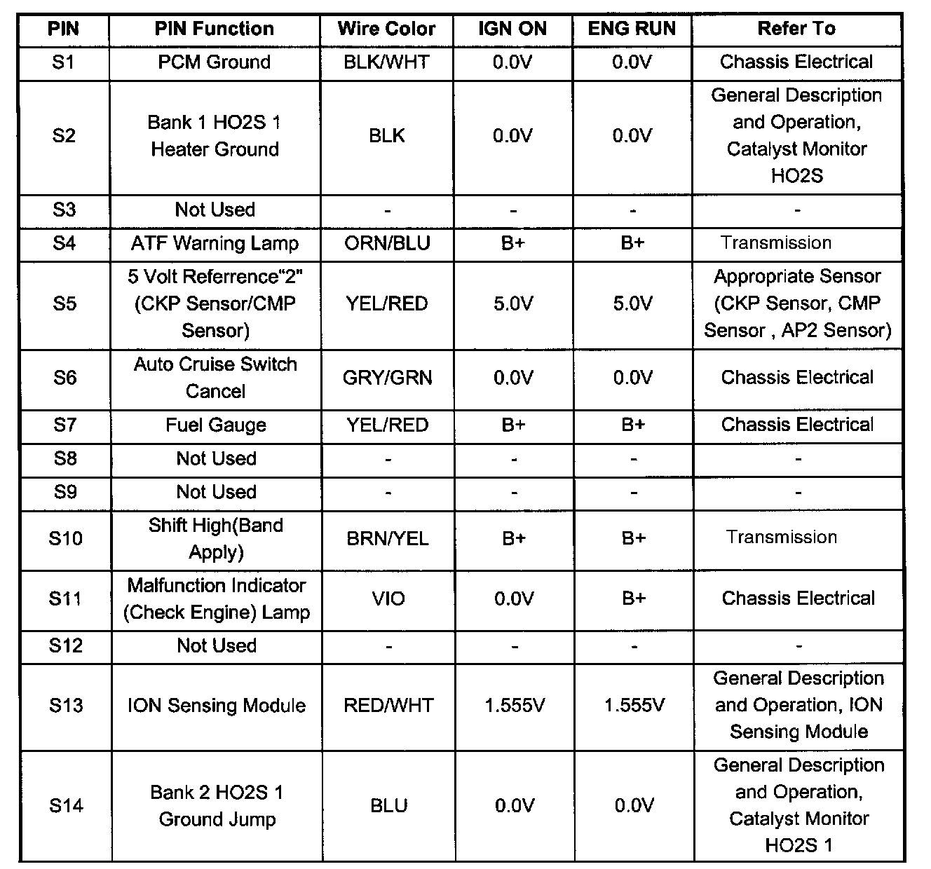 PCM Pinout Table, 80 - Way Red Connector - Row "S1 - 20" (S1 To S14):