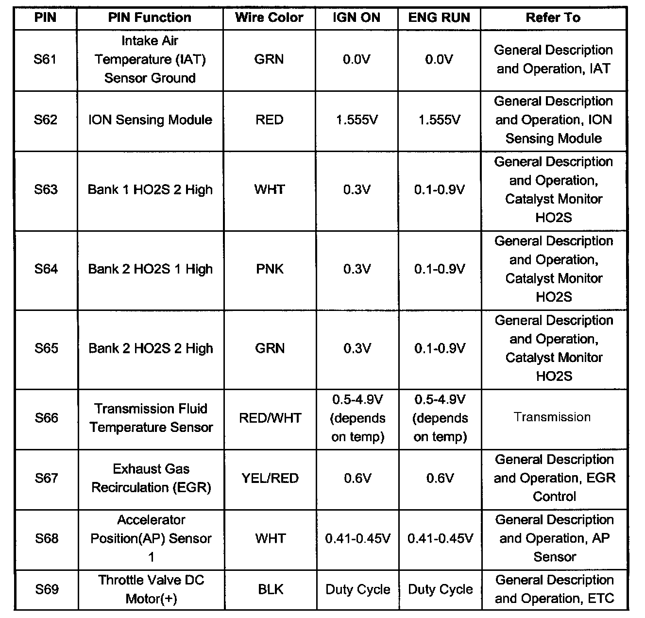 PCM Pinout Table, 80 - Way Red Connector - Row "S61 - 80" (S61 To S69):