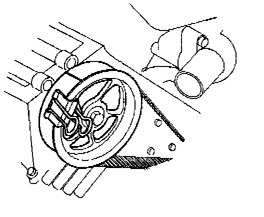 10. Remove crankshaft pulley assembly using J-8614-01 crankshaft holder, hold crankshaft pulley remove center bolt, then the pulley.