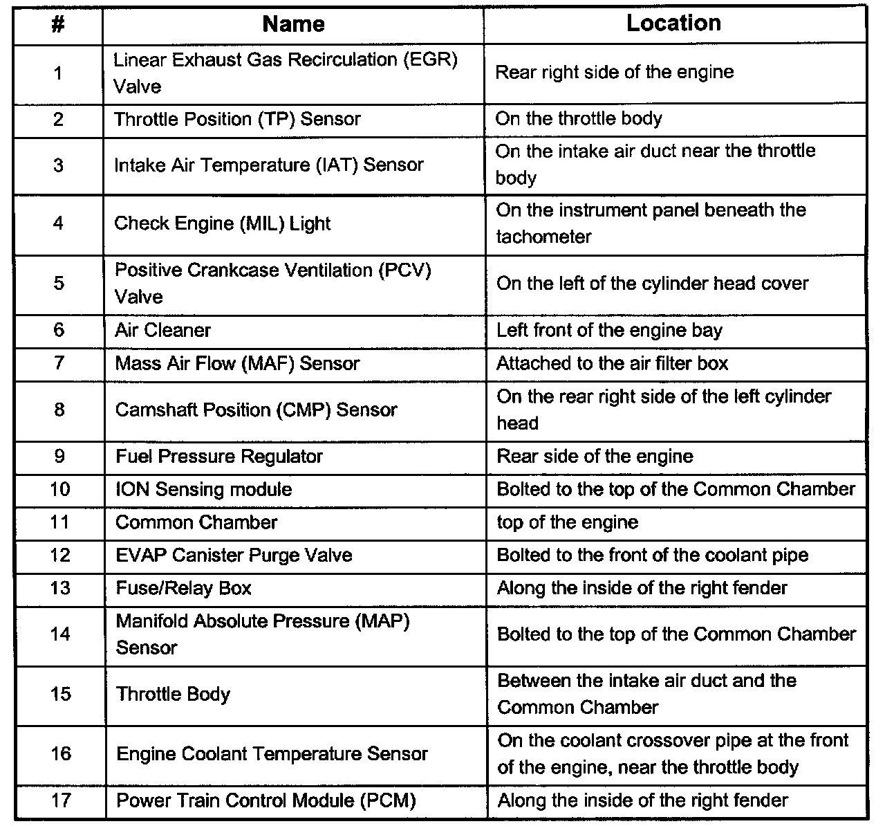 Engine Component Locator Table: