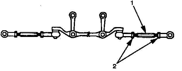 1. To adjust the toe-in angle, loosen the lock nuts (2) on the outer track rods (1) and turn the outer track rods. Turn both rods the same amount, to keep the steering wheel centered.