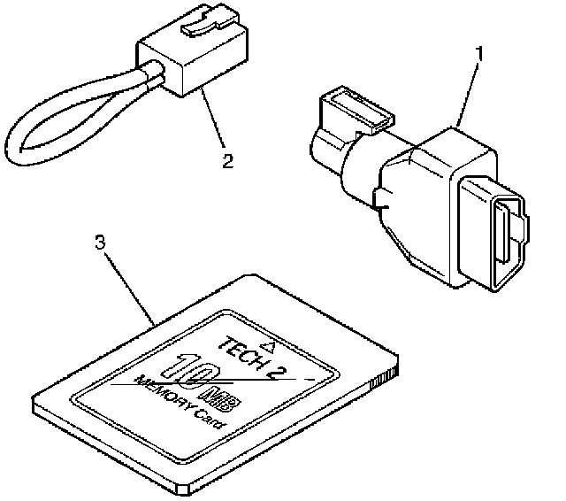 2. SAE 16/19 Pin Adapter (3000098)(1), RS232 Loop Back Connector (3000112)(2), and PCMCIA Card (3000117)(3).