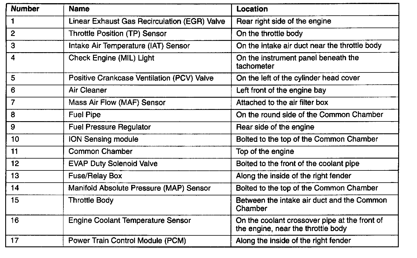 Engine Component Locator Table: