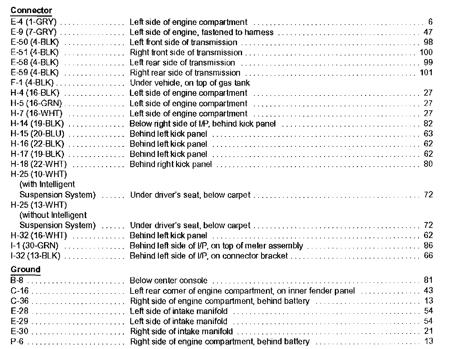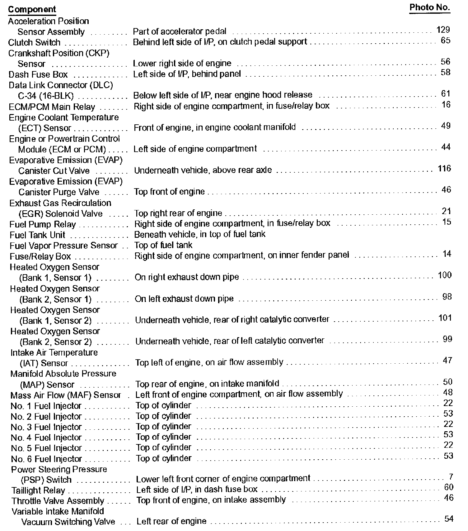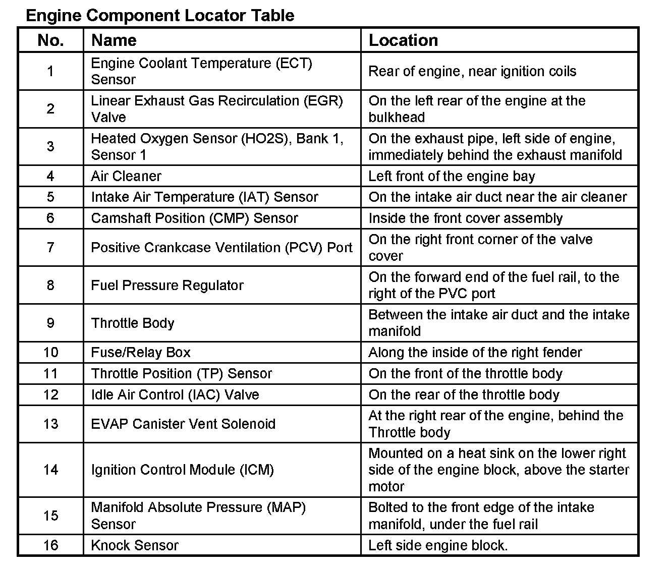Engine Component Locator Table: