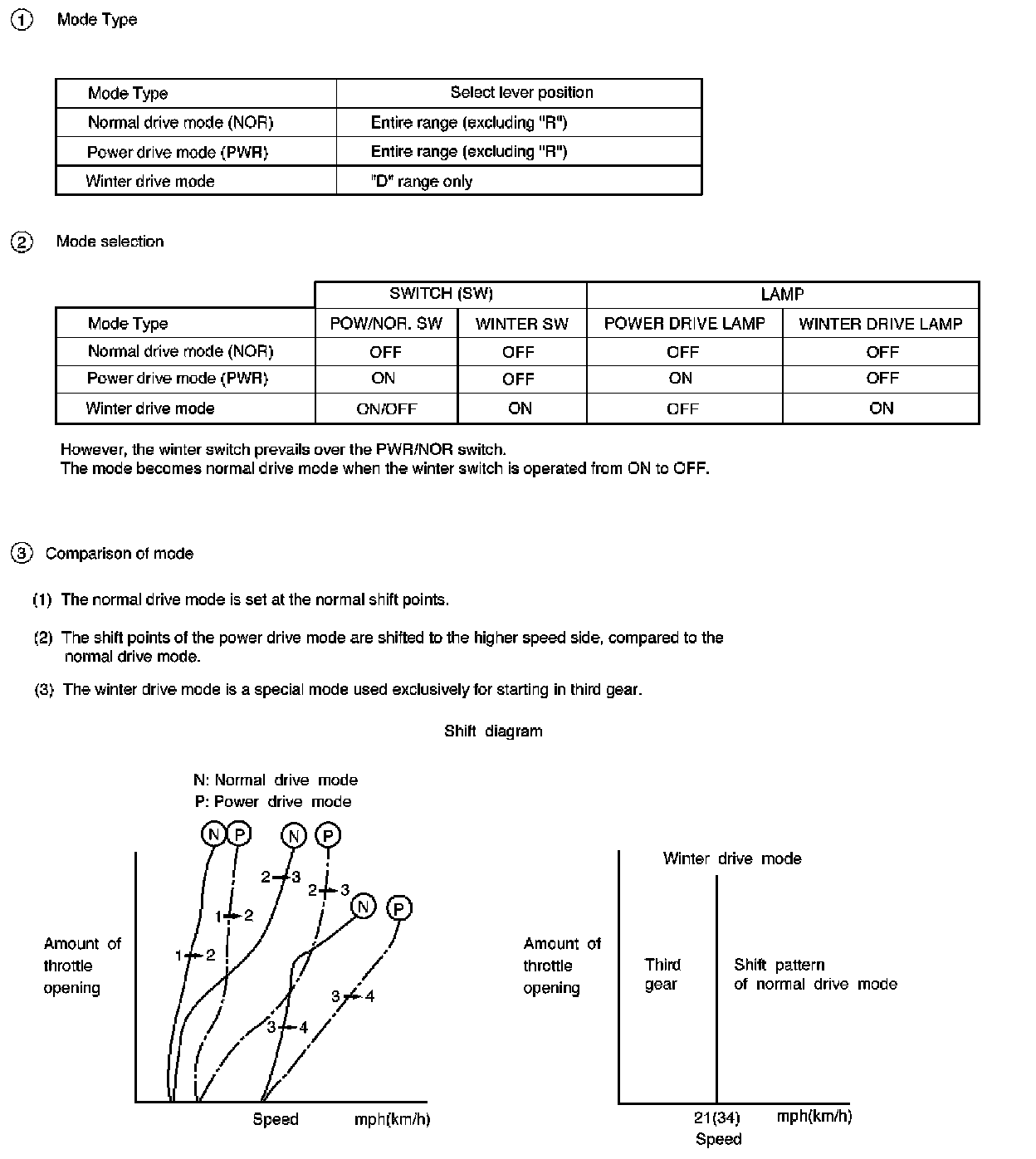 This mode is automatically activated from NORMAL mode only when downhill conditions are recognized. The shift pattern is identical to NORMAL mode except 3-4 and 4-3 shift lines at low throttle modified to get engine braking on a larger speed range.