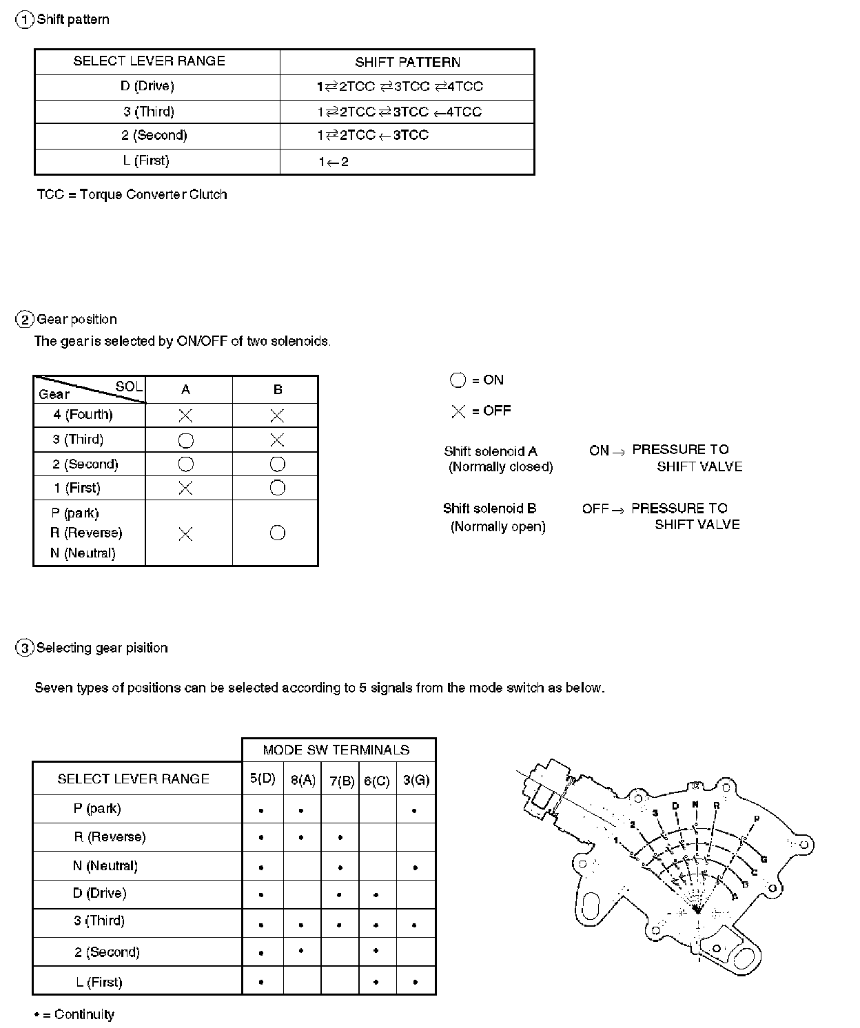 The transmission gear is shifted according to the shift pattern selected by the driver. In shifting gears, the gear ratio is controlled by the ON/OFF signal using the shift solenoid A and the shift solenoid B.