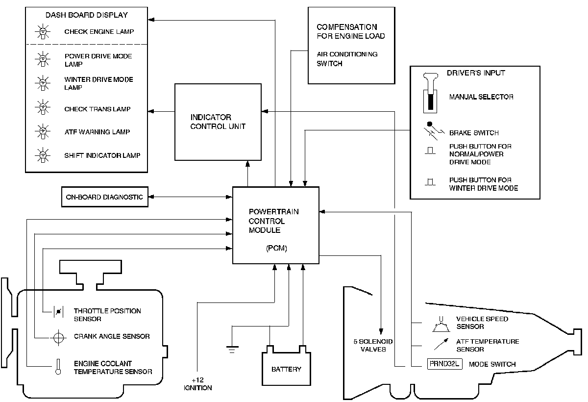 If a major system failure occurs which could affect safety or damage the transmission under normal vehicle operation, the diagnostic system detects the fault and overrides the Powertrain Control Module (PCM).