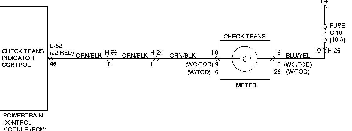 2. Verify if instrument panel terminal 3 (WO/TOD) or 6 (WO/TOD) of connector 1-9 is shorted to ground.